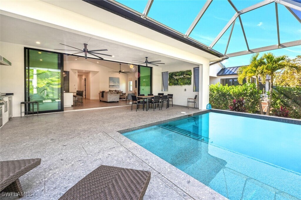 Welcome to your slice of paradise in Naples! Step into this stunning,newly constructed 2022 home where sleek,modern design meets luxurious outdoor living. The expansive outdoor space is an entertainer's dream — whether you're lounging by the sparkling pool with its inviting sunpad,dining al fresco with family and friends on the shaded patio,or grilling up your favorite meals in the fully equipped outdoor kitchen,this home offers the ultimate tropical oasis. After a day at the beach,rinse off in the convenient outdoor shower,just one of the many thoughtful touches that make this property feel like a private retreat. Inside,the open-concept design creates a seamless flow throughout the home. The chef-inspired kitchen features a massive island perfect for meal prep or casual dining,while the spacious living area with vaulted ceilings offers plenty of room to relax and unwind. Three beautifully appointed bedrooms,each with its own closet and TV,ensure comfort and privacy for everyone in your group. The luxurious bathrooms are nothing short of spectacular — the primary bedroom boasts a large,en-suite bathroom designed with relaxation in mind,while the spacious guest bathroom ensures comfort for everyone. High-end finishes and modern touches throughout make this home truly one-of-a-kind. Need extra space? The oversized two-car garage and modern laundry room offer all the conveniences you could ask for. Located just minutes from downtown Naples,this home puts you right where you want to be — close to stunning beaches,cultural landmarks like the Naples Botanical Gardens,and exciting social spots like Celebration Park. Whether you’re here for a week or longer,this home gives you easy access to everything that makes Naples so special. Don't miss the chance to experience the best of Naples in a home that's designed to impress. Book your stay today!