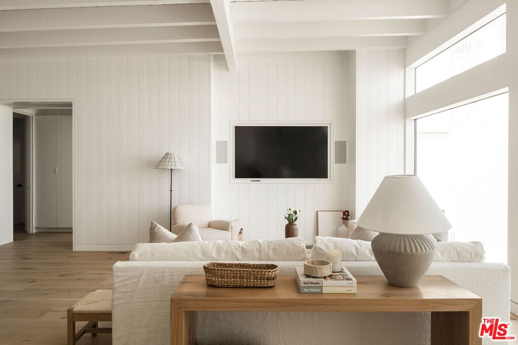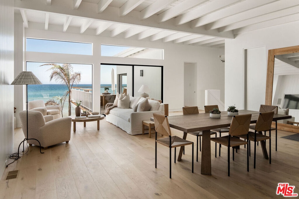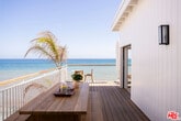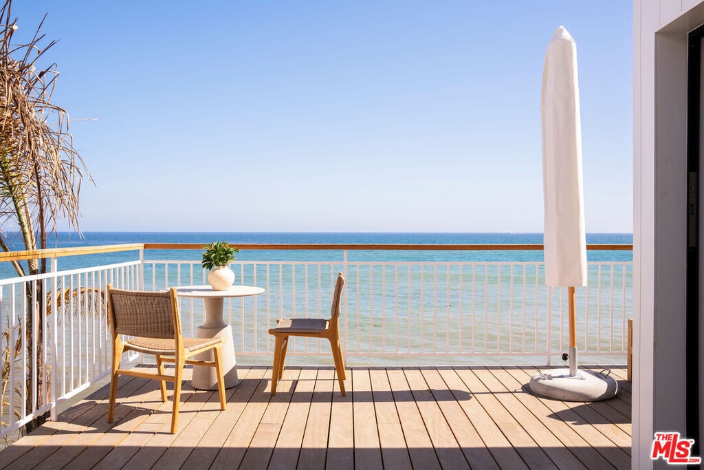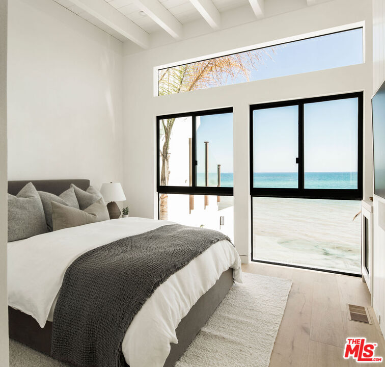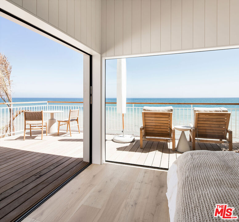Situated off of PCH on the Private Escondido Beach Road, sits this Mid-Century gem on 50 feet of the exclusive and coveted Escondido Beach. Embrace the opportunity to call this special property home, that has been extensively and meticulously reimagined by design team Warren Garrett. The newly completed home elegantly blends timeless materials with modern amenities and exudes a restrained sophistication. The turnkey beachfront residence offers 4 bedrooms, 4.5 baths, two levels of expansive waterfront decks and features a gorgeous french grey plaster pool that takes center stage only a few steps from the sand. This idyllic beach house is conveniently located steps away from the iconic Geoffrey's restaurant and a leisurely beachside stroll to Paradise Cove Beach Cafe. Located near the end of a private street, the peaceful retreat enjoys ample separation from Pacific Coast Highway. The clean design of the modest exterior facade is centered by an arched solid steel front door opening to panoramic ocean views framed with white oak floors and soaring exposed beam ceilings. An open gourmet kitchen showcases a grand Italian limestone island, exquisite stone shelving, a La Cornue range and new high end appliances. The main level features 3 bedrooms with spa-like en-suite bathrooms, while the lower level offers a 4th bedroom and full bathroom with breathtaking views of the pool and ocean beyond. A secondary bar and kitchen as well as a cozy interior lounge were designed to make this the perfect setting for pool and beachside entertaining. This home is furnished and is move-in ready with brand new furnishings from Jenni Kayne Home, experience the best of coastal living in this unique Malibu beachfront paradise. MLS# 25596531