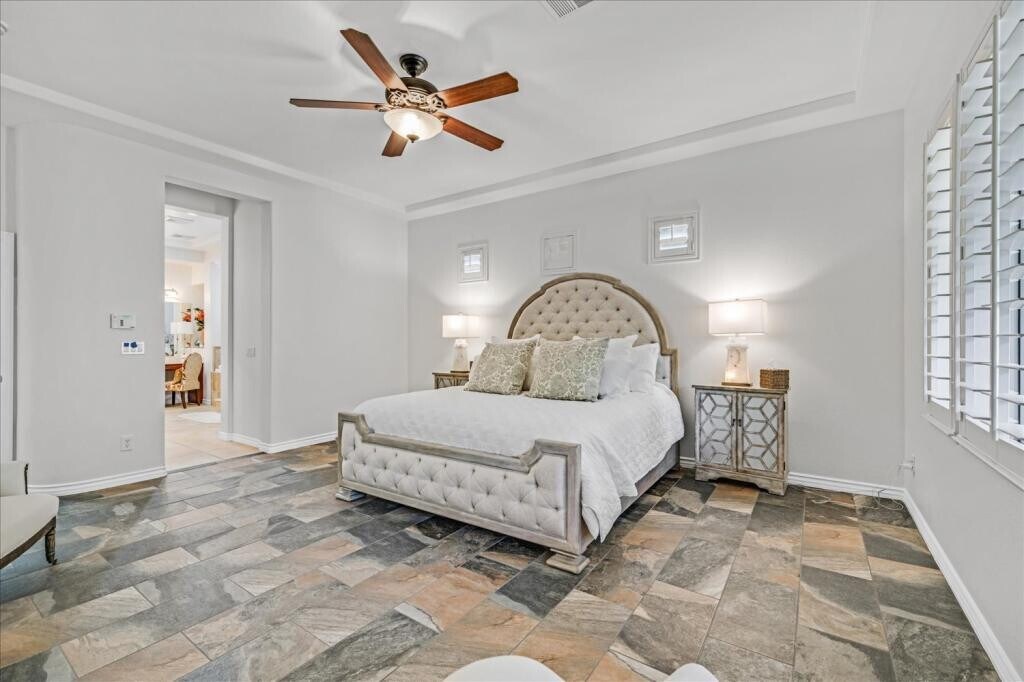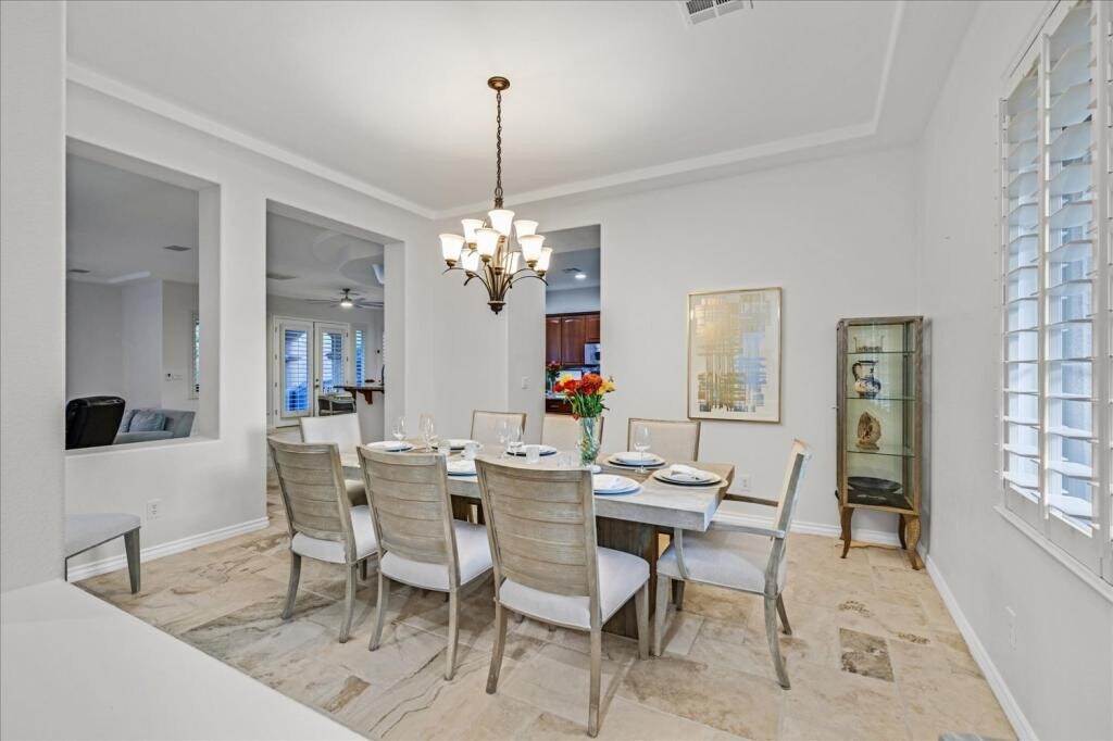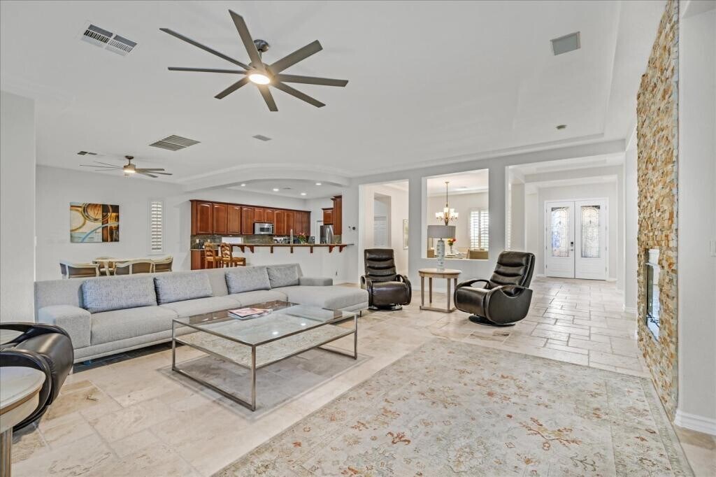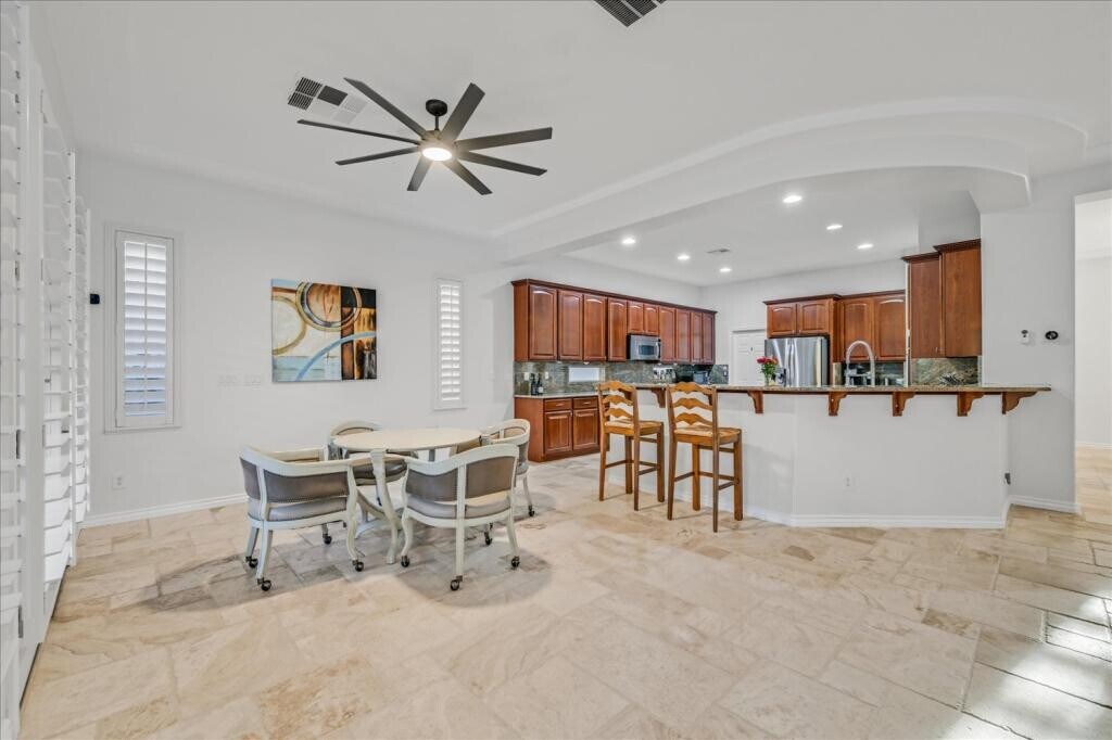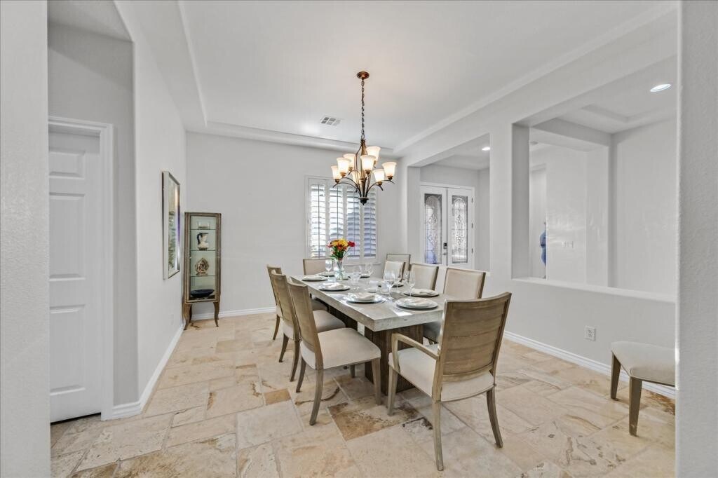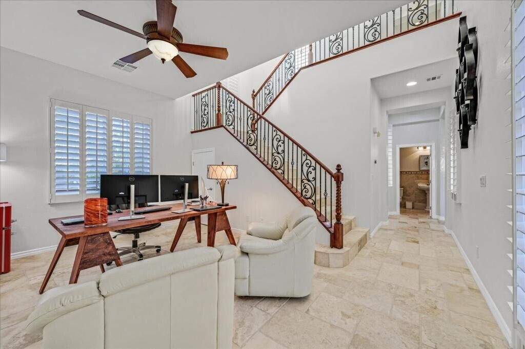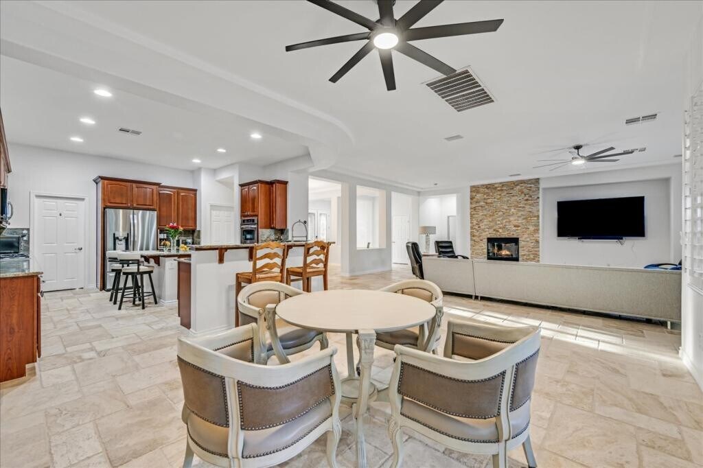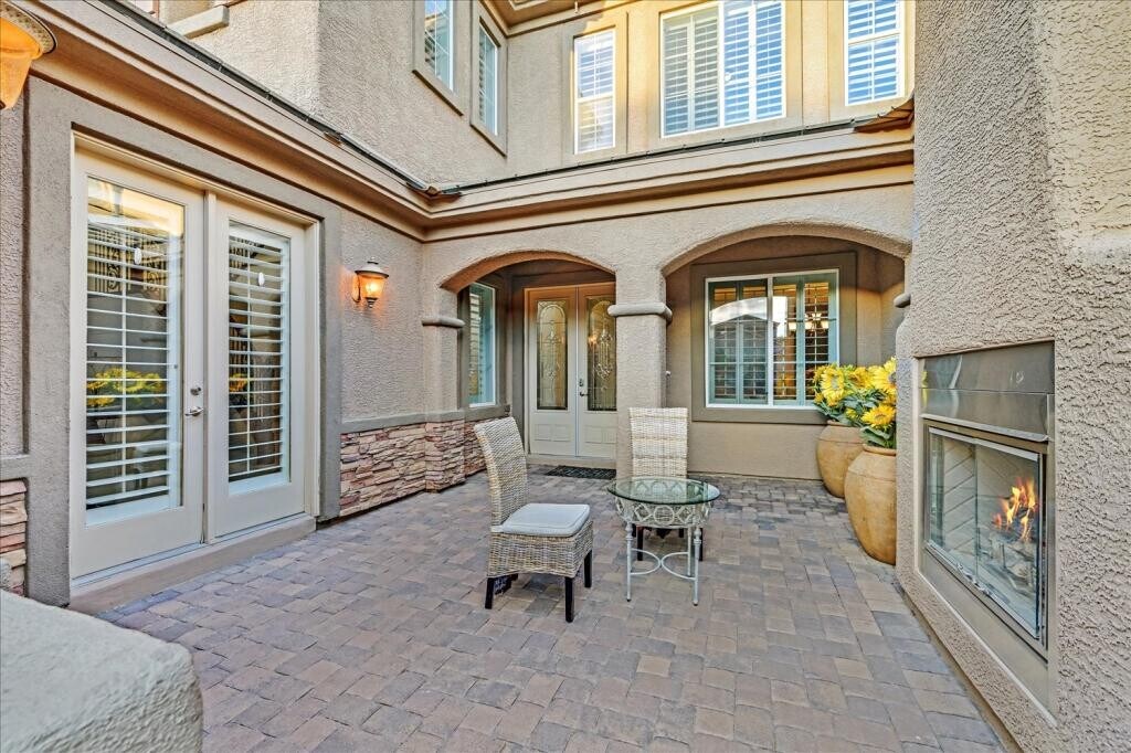 Experience luxury in this FULLY FURNISHED home, designed for comfort and entertaining. The backyard features a sparkling pool, side yard with fruit trees, and serene ambiance.The layout includes impressive features, perfect for those seeking space. The kitchen offers a breakfast nook, center island, and essentials for culinary enthusiasts. Relax in the great room with a fireplace, complemented by plantation shutters throughout. Upstairs, an expansive loft opens to a balcony overlooking the backyard, while four generously sized bedrooms w/3 of them having en-suite bathrooms. The primary suite, located on the first floor, includes a walk-in closet. Additional highlights include a formal dining room, downstairs den, and ample storage with numerous closets and cabinets.Enjoy the gated front courtyard with a gas fireplace and a private backyard with a covered patio and cypress trees for privacy.Located in Anthem Highlands\' gated Earlstone Estates, this home offers exclusivity tranquility.
