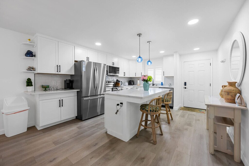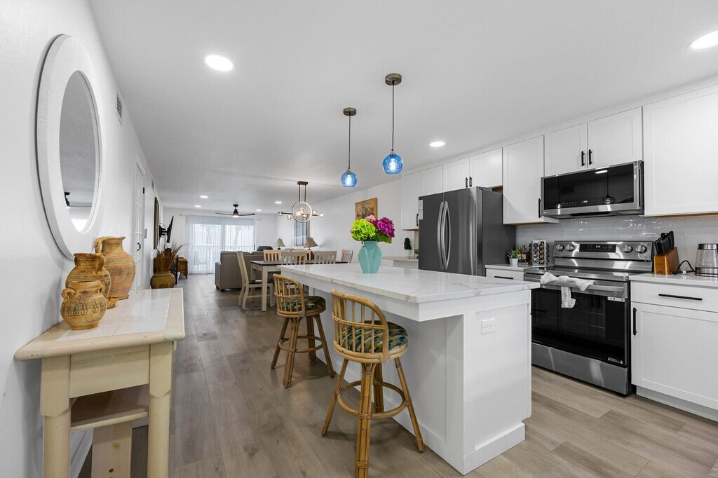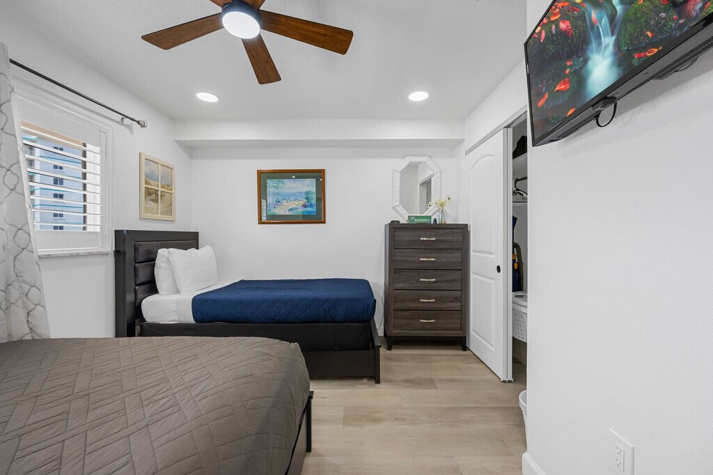 Wake up to breathtaking oceanfront views in this cozy 2-bedroom, 2-bath condo located on the third floor of Cocoa Beach Tower. Just steps away from private beach access and a sparkling pool, the highlight of your stay will be the large balcony accessible from both the living room and primary bedroom, offering panoramic views of the pool and the iconic Cocoa Beach Pier. Enjoy beautiful sunrises and captivating sunsets from this perfect vantage point. Nestled within the prestigious Cocoa Beach Towers, this cozy condo offers an exceptional retreat for those seeking an enchanting oceanfront experience. Step inside this coastal haven and be greeted by an inviting living space adorned with comfortable furnishings and a welcoming ambiance. The open-concept design seamlessly connects the living room, dining area, and kitchen, creating a cohesive space perfect for entertaining or relaxing. The master bedroom boasts a restful queen-sized bed with panoramic views of the Atlantic Ocean and balcony access. The secondary bedroom offers a snug haven with a queen bed. The well-appointed kitchen is equipped with modern appliances and a breakfast bar. The spacious living room features a flat-screen TV and stunning oceanfront views. During your stay, take advantage of the array of amenities within the Cocoa Beach Tower, including a refreshing pool and private beach access. This prime location offers an unforgettable experience for those seeking the perfect blend of relaxation and adventure. Cocoa Beach Tower is ideally situated within walking distance of shops, restaurants, and entertainment options. Enjoy a leisurely stroll along the bustling promenade of the Cocoa Beach Pier, with its eclectic boutiques, vibrant bars, and tempting restaurants. Nature enthusiasts can witness a rocket launch from the pristine shores of Cocoa Beach or enjoy a sunset walk along the pier. With its prime location and unparalleled views, this cozy condo is the perfect getaway. Our digital locks let you arrive and check yourselves in, but we’re here if you need us. Message us if you need anything during your stay. For urgent matters, call the number provided. Pets are not allowed. Mailbox access is not available for guests. All reservations require either a refundable security deposit or the purchase of a damage waiver. An initial stock of essentials like paper towels, toilet paper, tissues, coffee pods, creamer, sugar, light cleaning supplies, garbage bags, sponges, dish soap, and dishwasher tabs is provided, but guests should plan to replenish supplies as needed. [SI]
