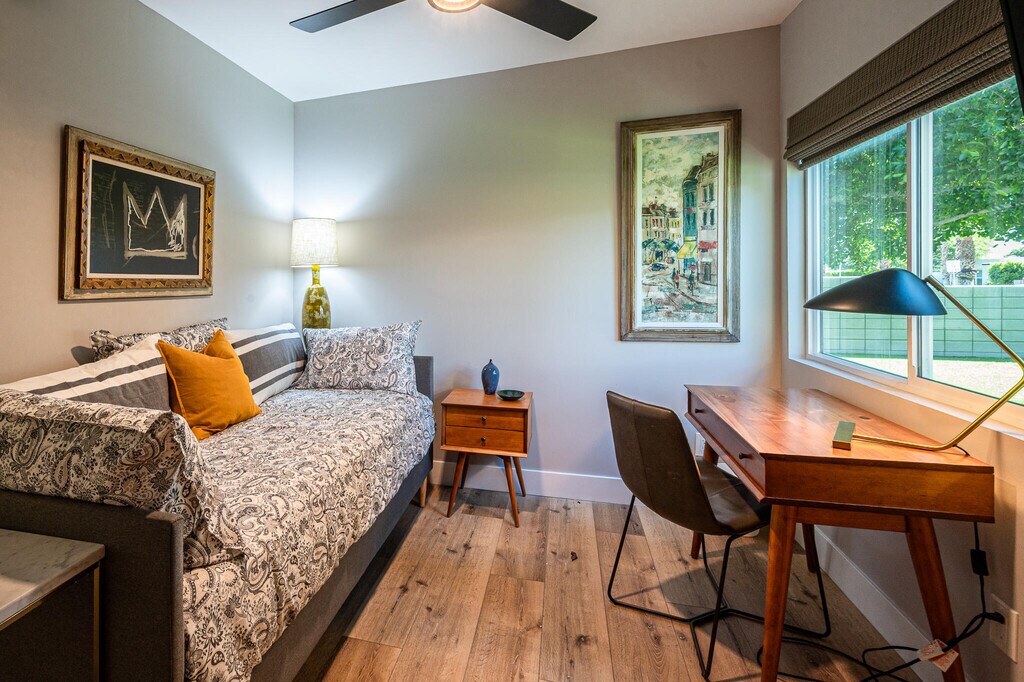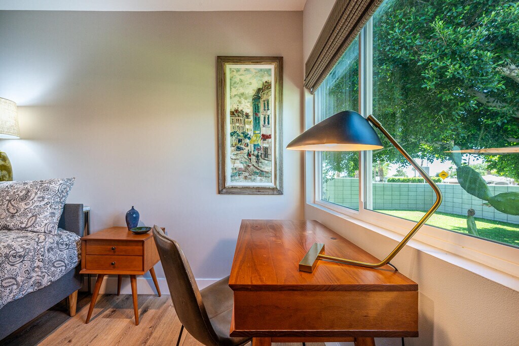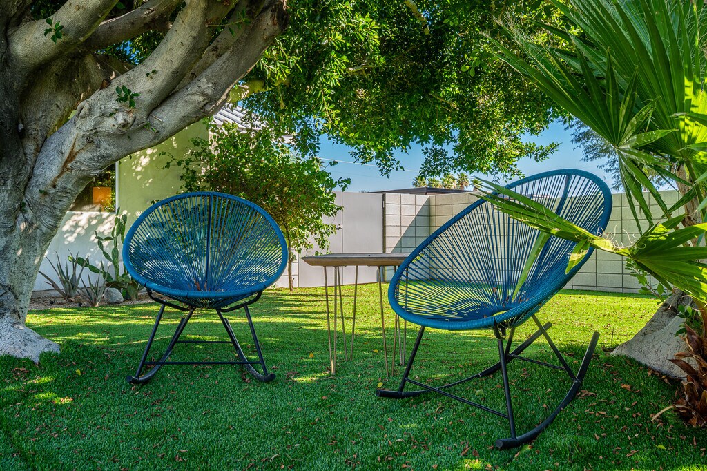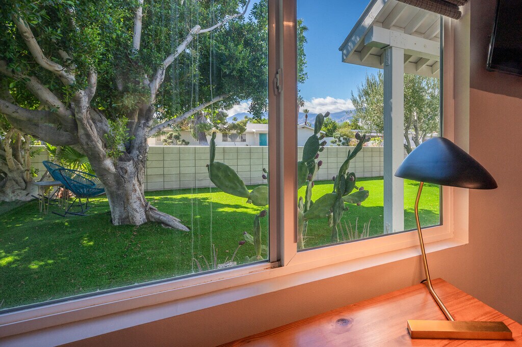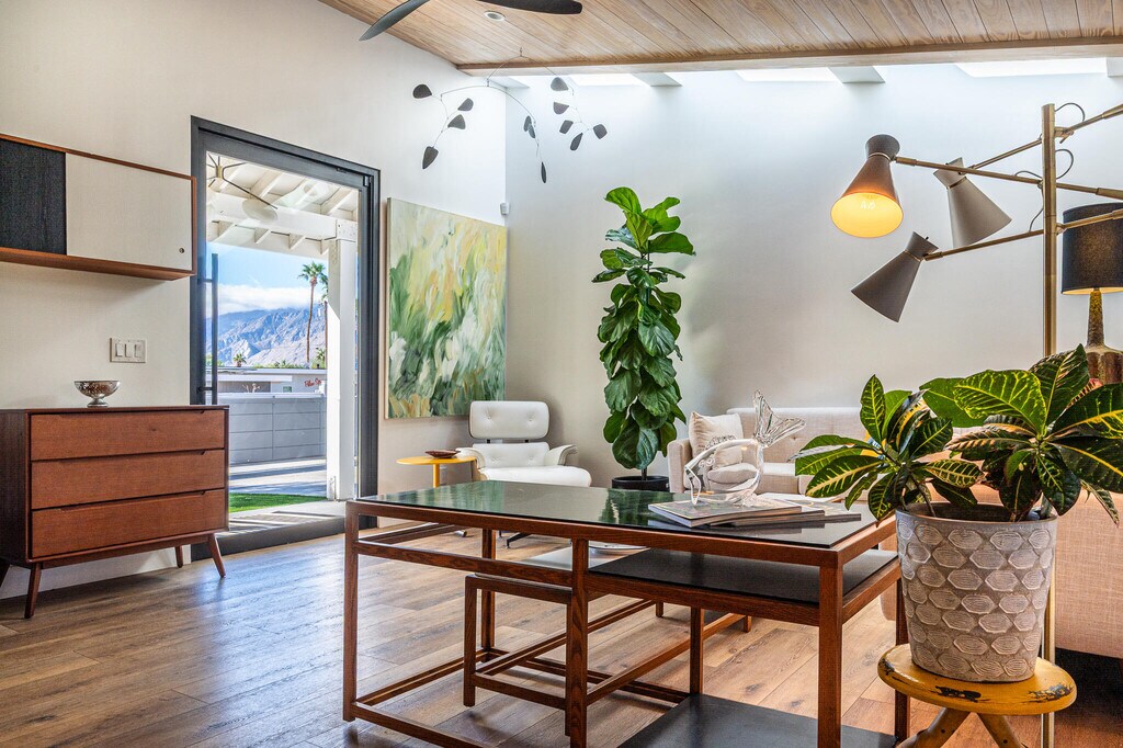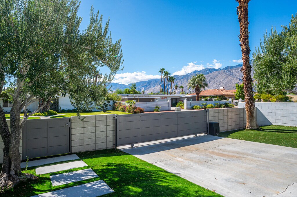 Modern designer home with mountain views! Fully renovated and reimagined contemporary home with panoramic mountain views in desirable Palm Springs. This modern residence features 3 bedrooms,2.5 baths,and exceptional attention to detail throughout. The entry showcases a stunning full-glass door,leading to an expansive living room with vaulted wooden slat ceilings and skylights that fill the space with natural light. The gourmet kitchen includes black stainless-steel appliances,quartz countertops,open shelving,and a breakfast bar,flowing into a dining area and denideal for everyday living and entertaining. The primary ensuite offers a spa-like bath with a soaking tub,walk-in shower,and custom closet system. Guest bedroom also features extra-deep closets with built-ins,and the third bedroom could pull double duty as an office or guest space with a daybed,wardrobe,and desk. Enjoy resort-style outdoor living with mountain views,artificial turf,a saltwater lap pool,above-ground spa,and a covered cabana with outdoor lounge and dining areas. An attached two-car garage with mini-split AC provides flexible use for fitness or workspace. The property is fully fenced with an electronic sliding gate,shaded front yard,and mature plants and trees. Offered fully furnished. Available now for a 12-month lease.