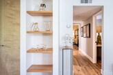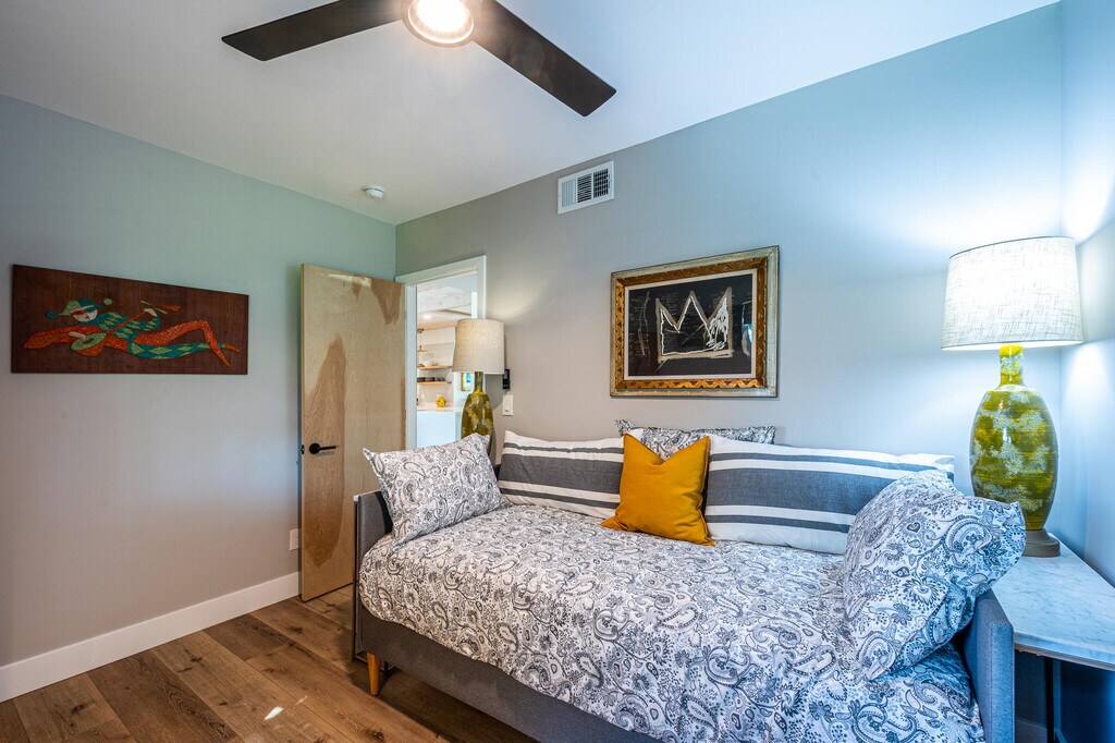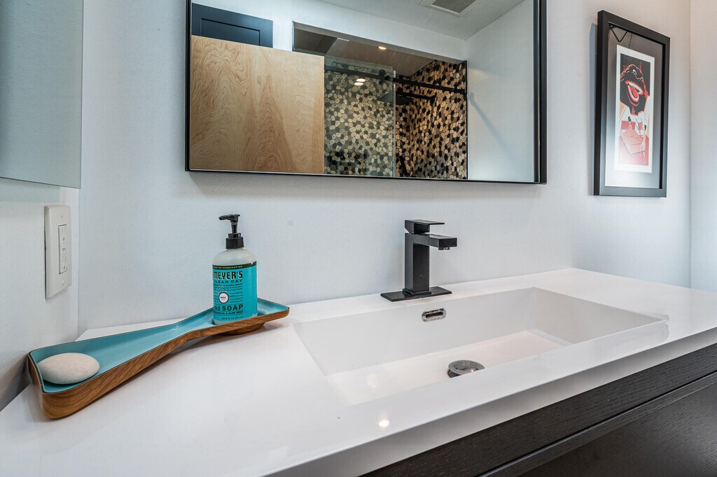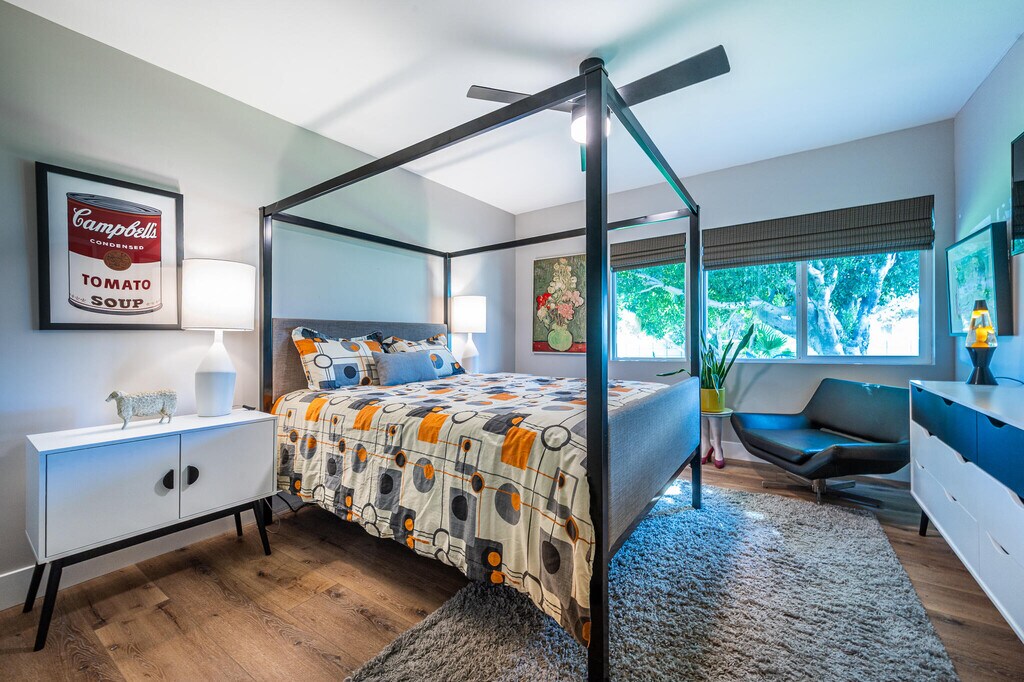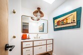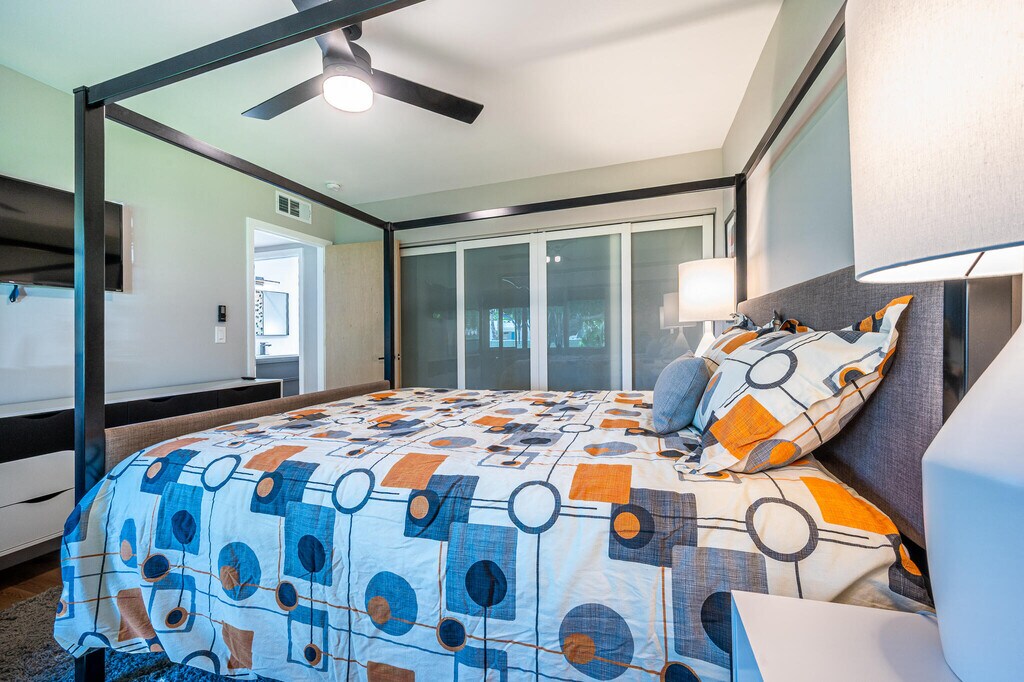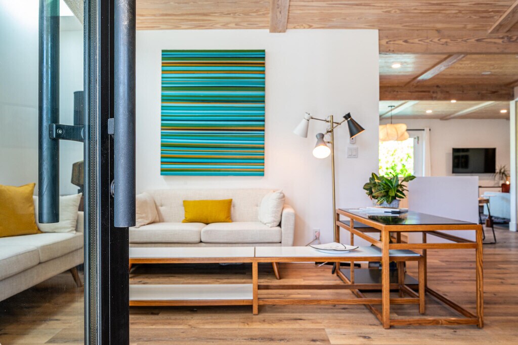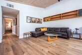 Modern designer home with mountain views! Fully renovated and reimagined contemporary home with panoramic mountain views in desirable Palm Springs. This modern residence features 3 bedrooms,2.5 baths,and exceptional attention to detail throughout. The entry showcases a stunning full-glass door,leading to an expansive living room with vaulted wooden slat ceilings and skylights that fill the space with natural light. The gourmet kitchen includes black stainless-steel appliances,quartz countertops,open shelving,and a breakfast bar,flowing into a dining area and denideal for everyday living and entertaining. The primary ensuite offers a spa-like bath with a soaking tub,walk-in shower,and custom closet system. Guest bedroom also features extra-deep closets with built-ins,and the third bedroom could pull double duty as an office or guest space with a daybed,wardrobe,and desk. Enjoy resort-style outdoor living with mountain views,artificial turf,a saltwater lap pool,above-ground spa,and a covered cabana with outdoor lounge and dining areas. An attached two-car garage with mini-split AC provides flexible use for fitness or workspace. The property is fully fenced with an electronic sliding gate,shaded front yard,and mature plants and trees. Offered fully furnished. Available now for a 12-month lease.