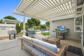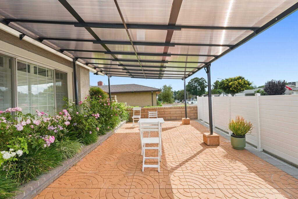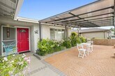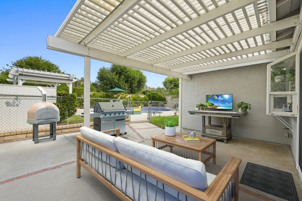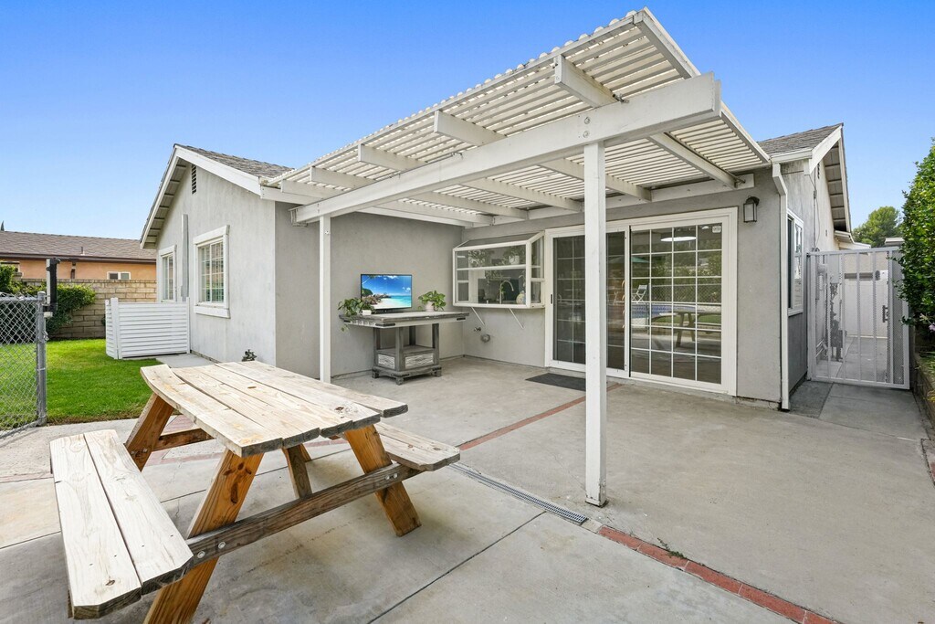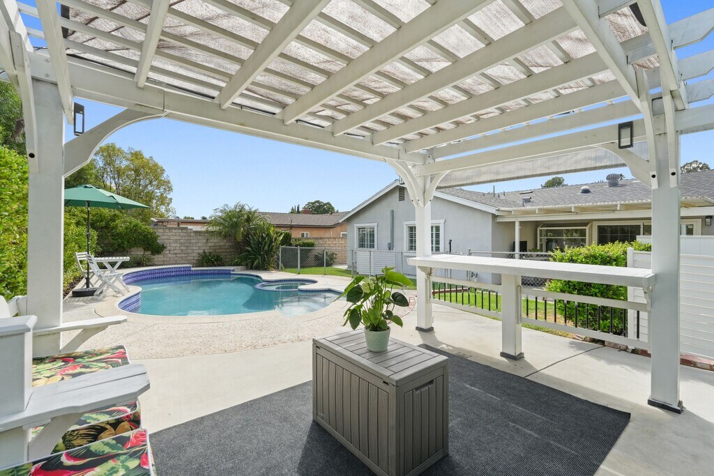 REMODELED!! 3 bedroom + DEN + 2 bathroom with PRIVATE resurfaced pebble pool and spa! Whole house water filtration, tankless water heater, EV charger, skylight, barn doors, new roof, re piped, new appliances are on the way including LG Wash Tower, Cafe 6 burners gas range & Oven, GE French-door Refrigerator, large front and back covered patios, plus a pool cabana, new AC, closet w/built-ins, plantation shutters, ceiling fans & movable kitchen island, wood laminate flooring * Walk thru sliding glass doors to the covered patio & grassy knoll to sit & relax & enjoy the pool & spa * The fenced, private yard w/lush vegetation and cabana is great for enjoying the evenings under the stars. * If you stay inside there's the new central air to keep you cool * Shopping, golf, parks and Metro Link station are close by.