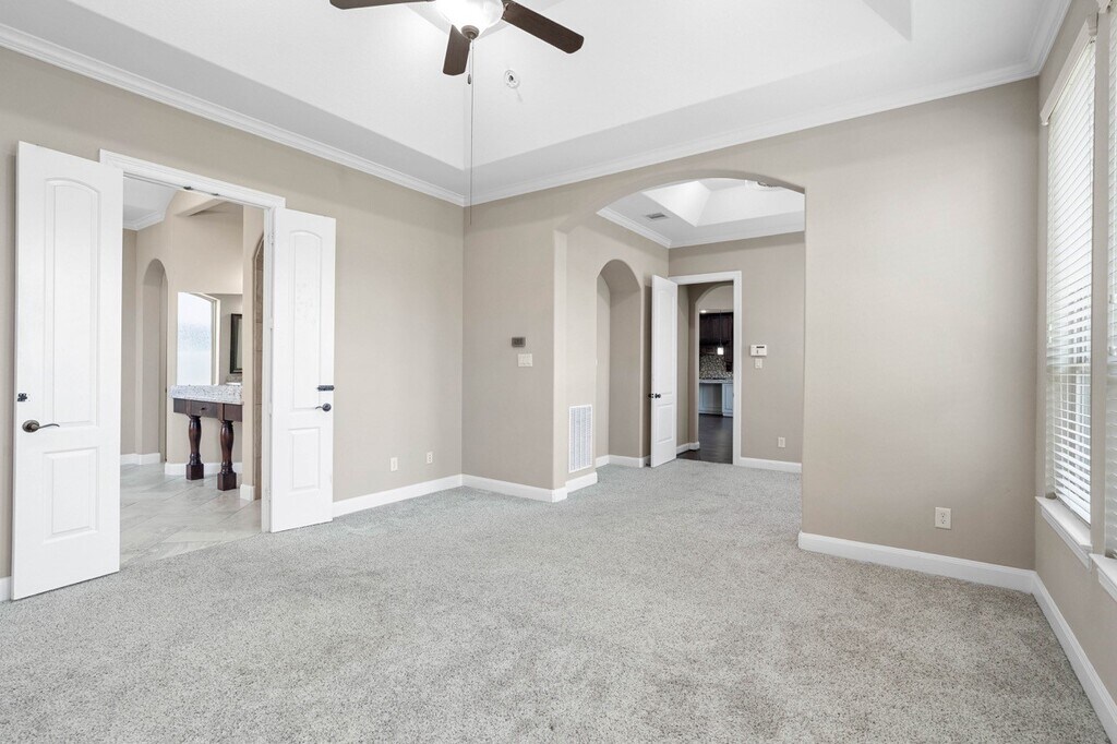 Backyard access to MayDell Elementary! Fresh interior paint!! Stunning design,this impressive two-story home offers enormous elegant living space with timeless architectural details throughout. A striking stone and stucco exterior welcomes you into a grand entry featuring arched openings,soaring ceilings,and rich wood flooring. The open-concept living area flows seamlessly into a gourmet kitchen equipped with an oversized island,custom cabinetry,granite countertops,stainless steel appliances,and designer lighting—perfect for entertaining. The private primary suite is a true retreat with a spa-inspired bath showcasing dual vanities,a soaking tub,and a large walk-in shower. Secondary bedrooms are generously sized,with ample closet space and well-appointed baths. Mother-in-law bedroom with a full bathroom downstairs is perfect for multi-gen families. Upstairs,a game room and media room. Washer,dryer,refrigerator included. Must see utility room connected to primary bedroom! MLS# 28926797