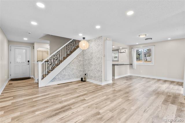 Beautiful community, centrally located with all appliances included. Nestled in a serene community surrounded by greenbelt and walking trails, this beautifully updated 4 bedroom end-unit townhome offers the best of low maintenance living. Thoughtfully designed with stylish upgrades, the home features a bright and inviting kitchen with custom cream cabinets, soft-close doors and drawers, honed slab granite countertops, and sleek stainless steel appliances. Durable and elegant luxury vinyl flooring spans the main level, where a spacious living room welcomes you with views of the greenbelt and a cozy wood-burning fireplace. The adjacent dining area leads to a private fenced patio with gated access to the walking path—perfect for enjoying the outdoors. A convenient powder room rounds out the main floor. An intricately detailed wrought iron staircase leads to the upper level, where you'll find three bedrooms, including the primary suite with a private ¾ bath, as well as a full bathroom. The finished basement adds versatility with a fourth bedroom, an additional ¾ bathroom, and a laundry area. The attached two-car garage is a standout feature, boasting a professionally coated floor, a heater, and a water/hose bib for added convenience. Located in the highly regarded Cherry Creek School District, The Shores community offers an array of amenities, including scenic trails, three picturesque ponds, indoor and outdoor pools, a clubhouse, and more! This is a fantastic opportunity to enjoy comfort, convenience, and a prime location. Townhouse MLS# 6731539