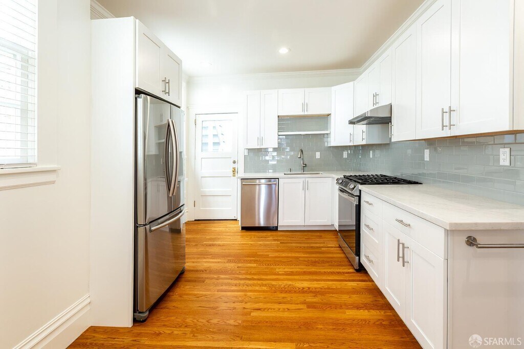 Exquisite Pacific Heights upper condominium set within a distinguished two-unit residence, accessed by a private entry. A formal foyer opens to a gracious living room with a decorative fireplace and partial views of the Golden Gate Bridge and the Bay, creating a comfortable and inviting setting. The formal dining room flows seamlessly into a large eat-in chef's kitchen appointed with newer appliances, granite countertops, and generous custom cabinetry. This level is completed by a stylish half bath and in-unit laundry. A gracious staircase ascends to the top floor, where the serene primary suite featuring a decorative fireplace and French doors opening to a sun-filled front-facing sunroom with views of the Presidio, Golden Gate Bridge, Palace of Fine Arts, and the Bay. The refined ensuite bath showcases a tiled shower and stone countertops. A second generously sized bedroom, also opens to the sunroom via French doors, is complemented by a beautifully renovated second bathroom off the hall. Completing the home is a private roof deck, ideal for quiet relaxation. Wonderfully located moments to the Presidio and within walking distance to premier dining, shopping, and transportation, this residence embodies classic San Francisco elegance with modern sophistication. MLS # 426095001
