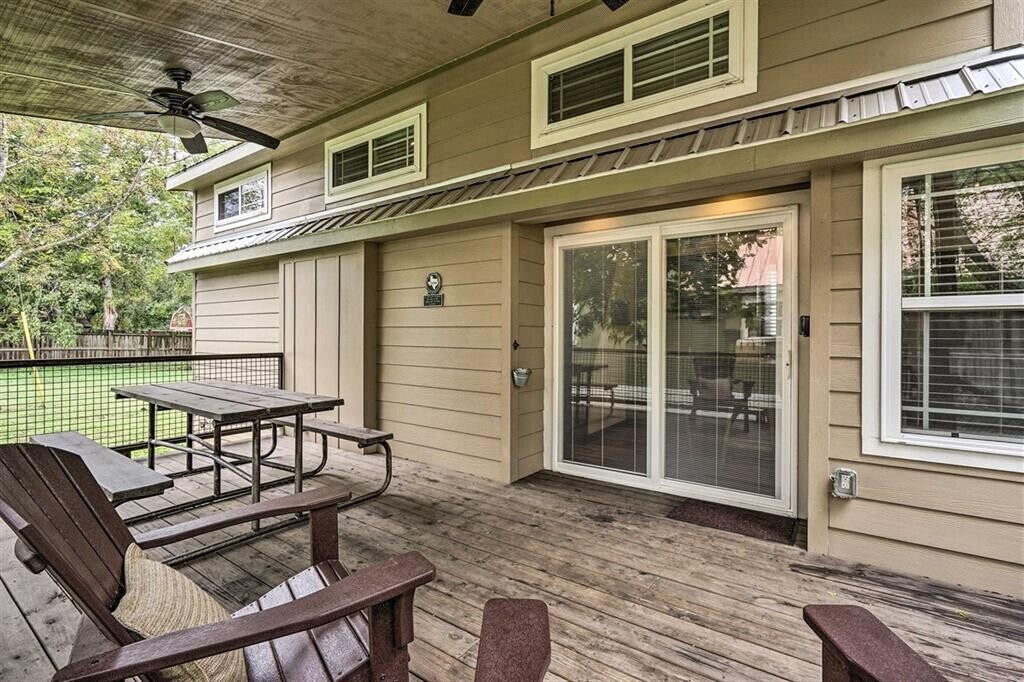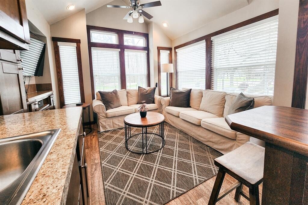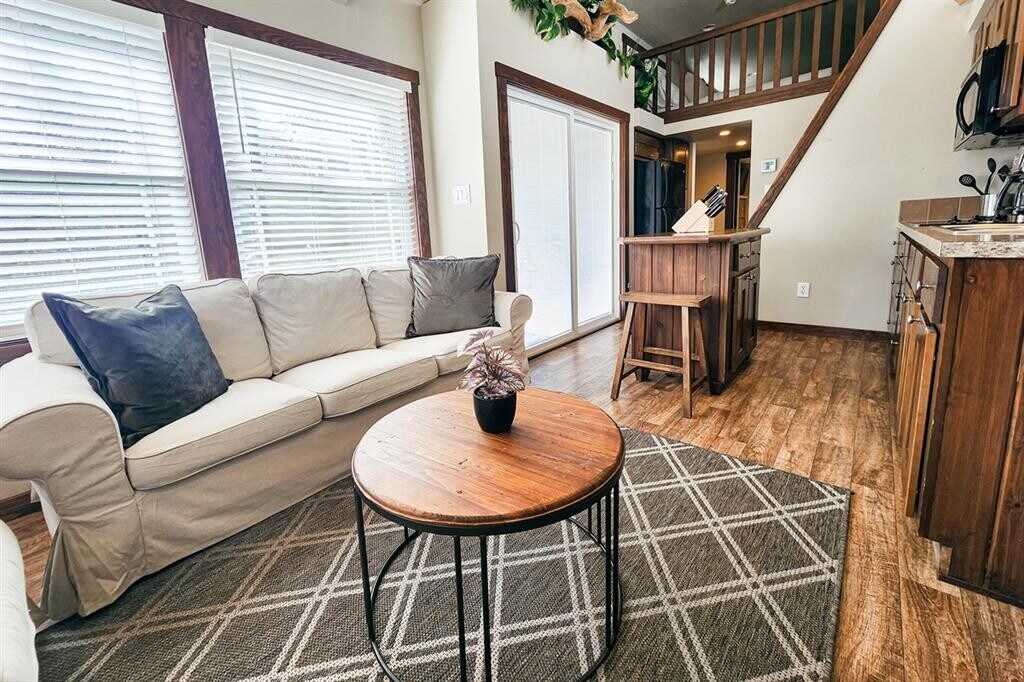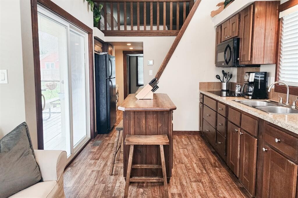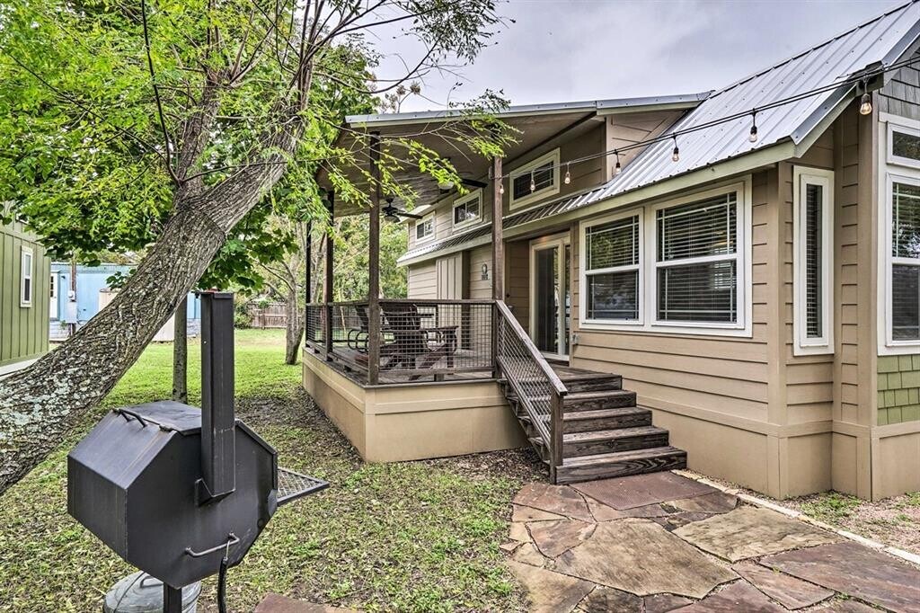 ALL UTILITIES INCLUDED, FULLY FURNISHED! Discover big charm in a small package! This beautifully designed tiny home in Staples, TX is fully furnished, fully equipped, and ready for move-in. The layout features a comfortable primary bedroom on the main floor plus a spacious loft outfitted for guests with two queen-size beds already in place. The living room boasts high vaulted ceilings, a ceiling fan, and recessed lighting throughout, creating a bright and inviting atmosphere. The kitchen includes a convenient island that doubles as a breakfast bar, a full-size refrigerator, electric stovetop, and microwave—everything you need to whip up your favorite meals. A washer and dryer are also included in-unit for added ease. All utilities are covered, making this an effortless, move-in-ready home. Nestled near the San Marcos River, this property offers a peaceful escape overflowing with small-town charm, while still providing quick access to San Marcos and New Braunfels for shopping, dining, and outdoor adventures. Turnkey living meets Texas Hill Country charm—schedule your showing via ShowingTime today!