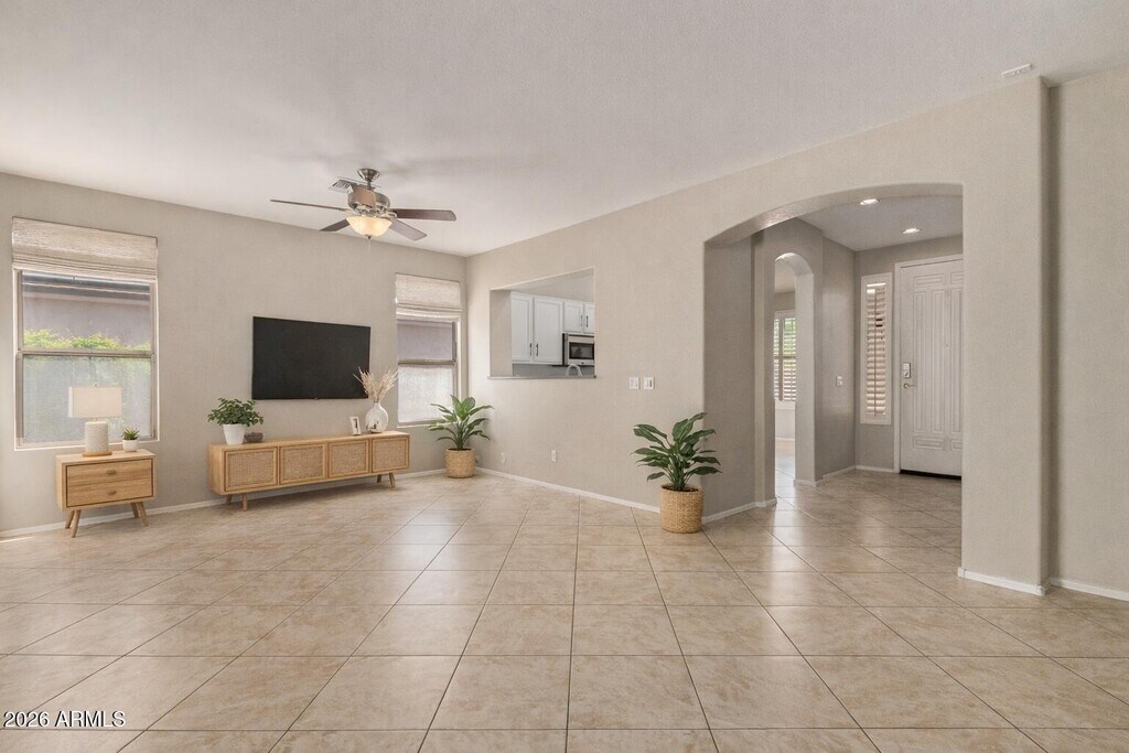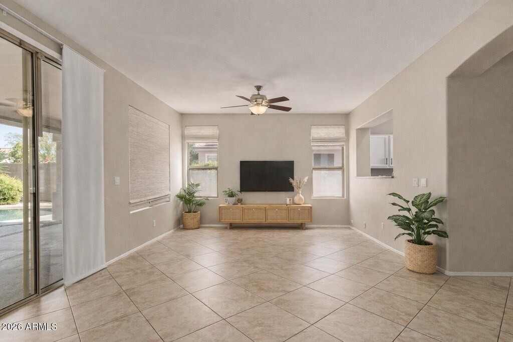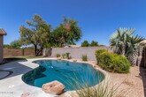 This well-maintained three-bedroom home offers comfortable living with spacious living and dining areas that flow seamlessly into the kitchen. The kitchen features stainless steel appliances and a convenient pass-through window that opens to the main living space--perfect for staying connected while entertaining or relaxing at home. The primary suite offers a private retreat complete with a walk-in closet and an ensuite bathroom. Additional bedrooms provide flexibility for guests,a home office,or family living. Step outside to enjoy a backyard with a sparkling pool,creating a great space to relax and unwind. Located in the desirable Dobson Place community,residents enjoy community-maintained pocket parks and a convenient location just minutes from shopping,casual dining,and easy access to the Loop 202,making commuting and daily errands effortless.