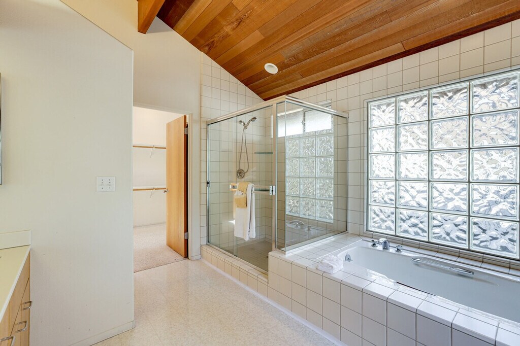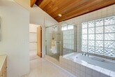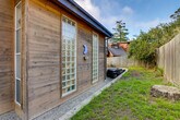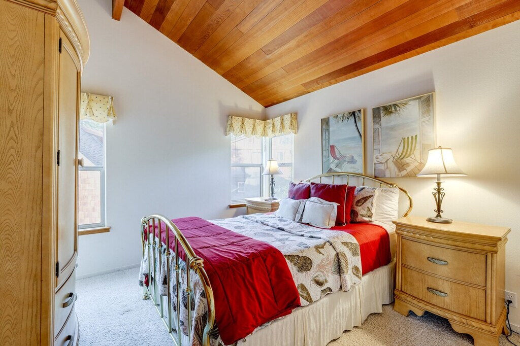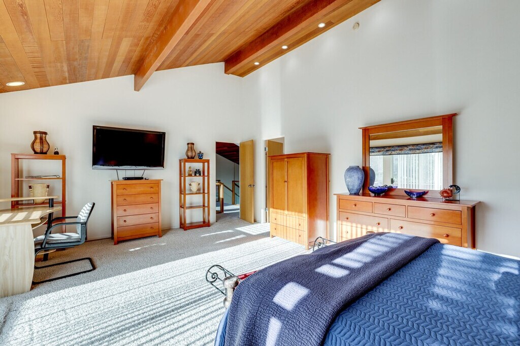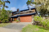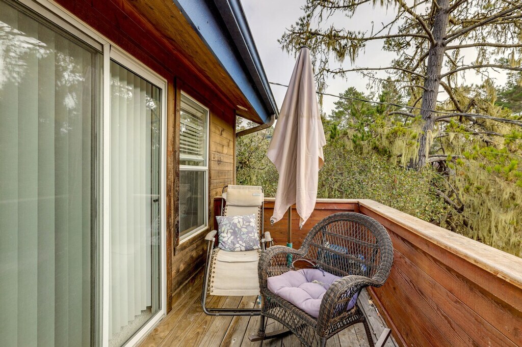 Feel at home in this Cambria vacation rental with sea ranch-style architecture, located 2 miles from Moonstone Beach and within walking distance of Fiscalini Ranch Preserve. This 2-story home requires 2 steps to enter, with interior steps throughout the 1st floor. All bedrooms are on the 2nd floor. This home offers 3-bedrooms and 2.5-bathrooms. This home provides everything you need for relaxation, including a full kitchen, a retro conversation pit, a smart TV, a dining table, a fireplace, a work desk, and a soaking tub. The kitchen is equipped with a dishwasher, refrigerator, stove, oven, microwave, drip coffee maker, toaster, cooking basics, dishware, flatware, trash bags, and paper towels. Enjoy the backyard, balcony, and gas grill. Additional amenities include central heating, towels and linens, and a hair dryer. Driveway parking is available for 2 vehicles, along with free street parking. Days are best spent lounging on the beach, exploring vineyards, and seal-spotting along cliffside trails. The property is not equipped with air conditioning. There is one exterior security camera on the right side of the garage facing the street, which records video and sound when activated by motion. No smoking, pets, events, parties, or large gatherings are allowed. Additional fees and taxes may apply, and a photo ID may be required upon check-in. [SI]