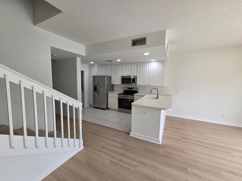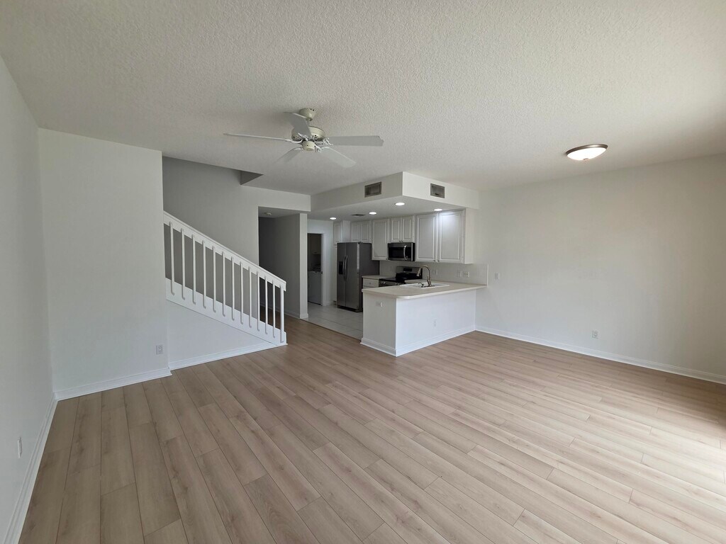 Welcome to this inviting 3 bed, 3 bath, 2-story townhouse located in the desirable Martinique community of Abacoa. Situated as an end unit, this home offers ample green space in the rear and side yards, plus, two front porches, providing a private and tranquil setting. Upon entering, you are greeted by a bright and open floor plan featuring high ceilings and a freshly painted interior. The first floor encompasses an adaptable space with brand new wood flooring throughout, complemented by a full bath nearby. The spacious living area seamlessly flows into the dining and kitchen areas, perfect for both casual family meals and entertaining. Step outside to enjoy the screened-in lanai, ideal for year-round entertaining and relaxation. Brand new roof installed 2024.