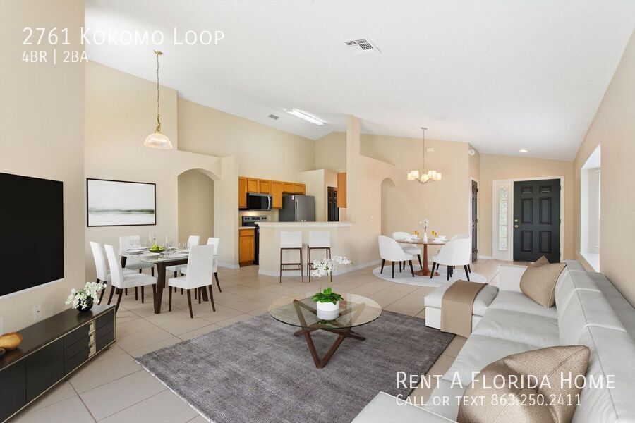One or more photo(s) has been virtually staged. One or more photo(s) has been virtually staged. Move-in ready, pet friendly, and lawn care and pool maintenance included! Enjoy fresh interior paint, new carpeting, vaulted ceilings, and a 2022 roof in this Grand Lagoon model at 2761 Kokomo Loop, in the prestigious Five-Star Southern Dunes Golf and Country Club Community. The spacious, open-concept layout seamlessly combines living, dining, and kitchen areas, complete with stainless steel appliances, a breakfast bar, and a pantry. The space flows effortlessly to the covered lanai and private screened-in pool—ideal for entertaining or relaxing in true Florida style. Tile flooring, large sliding glass doors, and neutral tones create a bright, welcoming atmosphere throughout. The home offers two ensuite bedrooms, including a primary suite with direct pool and lanai access, plus a private entry from the bath for added convenience. Residents enjoy 24-hour gated security, a clubhouse, floodlit driving ranges, tennis courts, a fitness center, playground, and more. Just minutes from shopping, dining, Orlando, Tampa, area beaches, and major airports, this property is ideal for full-time living. Don’t wait—schedule your private showing today! To schedule a tour, please copy and paste this link to your web browser Https Or call 2 Car Garage Community Pool Furnished Fully Gated Community Inground Pool With Safety Fence Lawn Care And Pool Maintenance Included! Range Screened Porch Tile Washer/Dryer Hook Ups Washer/Dryer In Unit
