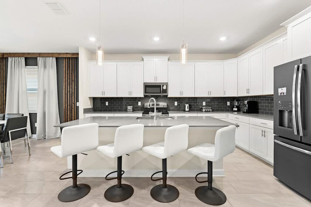 Enjoy a memorable stay at this modern 6-bedroom, 5-bath home in Storey Lake, accommodating up to 16 guests. With a private heatable pool, fully equipped kitchen, and spacious living area, this home offers comfort and fun for an unforgettable getaway. Themed Frozen, Star Wars, and Mickey rooms add a unique touch, making it perfect for both kids and adults. Located near top attractions, this home combines stylish décor with the best location for your Orlando adventure. Welcome to this stunning 6-bedroom, 5-bath home in the sought-after Storey Lake Resort, one of the best locations in Orlando. Just minutes from Disney and other top attractions, this home is the perfect base for an unforgettable vacation. The chic décor and inviting design impress from the moment you enter. The spacious living room flows seamlessly into a fully equipped kitchen and dining area, ideal for gathering, cooking, and sharing meals. Step outside to your private, heatable pool for sunny afternoons or relaxing evenings. Unique themed bedrooms spark imagination and delight, featuring a Frozen room with magical details, a colorful Mickey room, and a Star Wars room that feels out of this galaxy. For your convenience, the home includes in-unit laundry, free WiFi, parking, and a starter welcome kit with essential kitchen and bathroom items. Pool heating and BBQ grill rental are available as optional services. Pool heating is available upon 24 hours advance request for an additional fee of $35 plus tax per day with a minimum of 3 consecutive days. A $35 fee plus tax is required for the usage of the grill. Pets are welcome in units of 6-9 bedrooms with an additional cleaning fee of $300 for one pet plus tax per stay or $200 per pet for two pets or more. Unauthorized pets incur a non-refundable penalty fee of $500 plus tax per stay. Smoking is prohibited in the house or patio/pool area with a non-refundable fee of $250 plus tax for any signs of smoking. Experience the luxurious vacation community of Storey Lake Resort, where magical adventures await just 4 miles away at Disney World. With Universal, Sea World, and other parks just minutes away, endless entertainment is at your fingertips. Spectacular outlet shopping and fine dining options are also within a quick drive from the resort. At Storey Lake, enjoy top-notch amenities at "The Hideaway Club," including a fitness center, poolside dining and bar, resort heated pool and spa, lazy river, mini golf, water slides, splash pad, and kayak rentals. Check-in is at 4:00 PM and check-out is at 10:00 AM. Early check-in and late check-out are available upon request and subject to availability. Quiet hours are between 10:00 PM and 8:00 AM. The property is self-catering, and guests should bring or buy necessary items beyond the complimentary starter kit. Guests are responsible for emptying trash bins and disposing of garbage appropriately. A fee of $100 plus tax is charged for excessive trash left in the house or overflowing bins. The home is equipped with a central HVAC system, and guests should not set the temperature lower than 70ºF or above 78ºF. Unauthorized additional guests will incur a penalty of 50% of the total night rate of the reservation plus tax. The property is 100% smoke-free, and any signs of smoking will result in a $250 fee plus tax. Pets are not allowed inside the pool at any time. [SI]