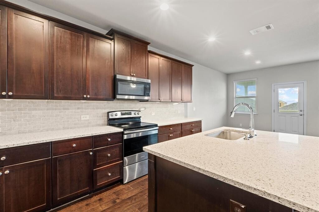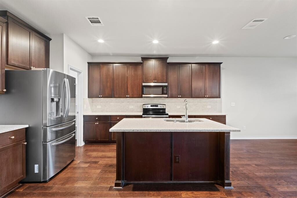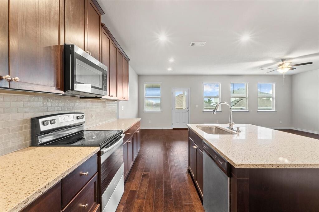Modern living meets small-town charm in this standout Stonewall Ranch gem. Nestled on the east end of Liberty Hill, this vibrant neighborhood offers a relaxed, friendly atmosphere with trails, parks, and top-rated Liberty Hill ISD schools. Step inside to discover a smart, flowing layout with 3 spacious bedrooms, 2 full baths, and an airy open-concept living space that’s built for connection and comfort. Soaring ceilings, warm engineered hardwoods, and recessed lighting set the stage. The spacious kitchen comes fully equipped with beautiful quartz countertops, stainless steel appliances, as well as a large island with bar seating. Thoughtful bedroom separation offers privacy and flexibility, with a tucked-away primary suite featuring a walk-in shower, dual vanity, and generous closet space. Located just minutes from HEB, Target, Costco, wonderful dining options, and everything Liberty Hill and nearby Leander have to offer. Easy access to 183, and downtown Austin in under 40 minutes. This one checks all the boxes!