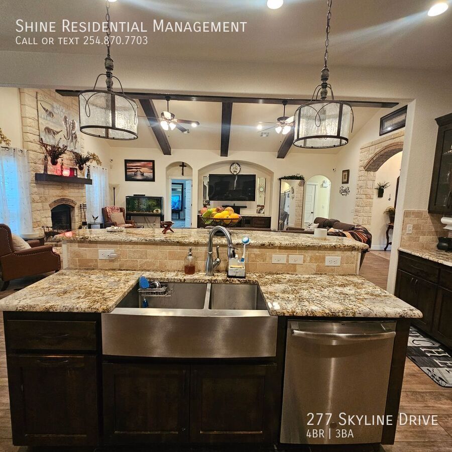 Welcome home! This spectacular custom home is breathtaking. You walk into foyer, which has the office on the left. Leading you into the spacious living area with beautiful, exposed trusses, high ceilings and the wood burning fireplace. The floor plan to the kitchen is open to the living area with a high bar area on the island. The bedrooms have a split floor plan with the main bedroom on the opposite side of the home. The main bedroom has high ceilings as well and a large walk in closest. The main bathroom has granite counter tops, dual sinks, jacuzzi garden tub, large walk-in shower. While the minor bedrooms are located on the opposite side of the home, featuring 2 bathrooms as well. Now, let's go to the large backyard that is prefect for entertaining purposes. It has an enlarged back concrete pad, pergola and outdoor kitchen, perfect for the TX summer BBQ parties. Schedule a showing today for this Gem. Cook Top Double Wall Ovens Dual Vanity Sinks Garden Tub Granite Counters Home Office/Bonus Room Large Back Patio Large Back Yard Large Walk In Shower Laundry Room Laundry Room Sink Outdoor Kitchen Pergola Tile/Carpet Floors Wood Burning Fireplace