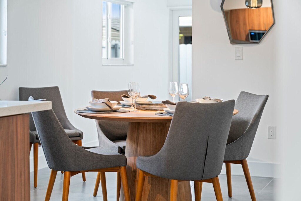 Welcome to this revamped retreat, ideal for up to six guests seeking a memorable Miami getaway. With three bedrooms and two fully renovated bathrooms, comfort and privacy are ensured. The highlight of this apartment is the backyard oasis, where you can enjoy the wonderful covered outdoor space. Step into your new retreat! This extraordinary and expansive residence beckons families and friends seeking to craft indelible memories together. With its dual-tier design and an expansive enclosed courtyard, this haven is artfully arranged. Room 1 features a queen-size bed, smart TV, two bedside tables, and an en-suite bathroom. Room 2 offers a bunk bed and smart TV, while Room 3 includes two single beds, a TV, and a bedside table. The living room is equipped with a modern sofa bed, smart TV, and coffee table. The dining area has a dining table and chairs for four. The modern kitchen is fully equipped with stainless steel appliances, a coffee maker, cookware, dinnerware, and utensils. It also features a breakfast bar with seating for four. The laundry room is equipped with a modern washer and dryer. The lavish bathrooms come stocked with all the essentials for your stay along with plenty of soft fluffy towels. Parking is available for up to four cars in the driveway. Early check-in and late checkout may be available for a cost of $75. Guests who stay beyond their checkout time without approval will be charged $100 per hour. Located in Miami, this apartment offers easy access to the vibrant city life and nearby attractions. Whether you're exploring the local dining scene or enjoying the beautiful beaches, you'll find everything you need within a short distance. The house has security cameras that cover only the exterior areas of the property, remaining on and in operation at all times for security purposes. The property undergoes rigorous cleaning and sanitization according to CDC standards. While the property is regularly treated for bugs and insects, Florida's sub-tropical climate can attract critters, so keeping doors closed is advised. Guests found smoking inside the house will be charged an extra $250 cleaning fee for odor removal. Unauthorized guests may incur a fine of $50 per unapproved guest beyond the home capacity. An extra charge of $50 will apply per unauthorized vehicle. This apartment does not include a dedicated home office set-up, but the spacious living area provides ample space for remote work if needed. [SI]