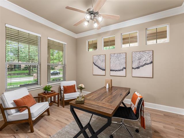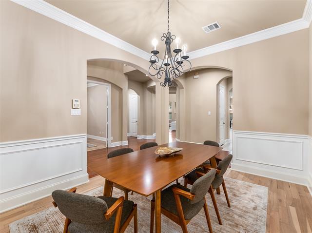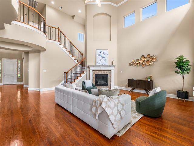 Situated on a picturesque tree-lined street in Frisco’s designated 5-star neighborhood of Pearson Farms, this impeccably maintained home is move-in-ready! Zoned to top-rated Vaughn Elementary, Pioneer Middle and Reedy High School, this home is ideal for people seeking the finest in education and lifestyle. Enjoy the charm of two inviting front porches, mature shade trees, and a vibrant community featuring scenic ponds, a resort-style pool, parks & warm, welcoming neighbors. Inside you’ll find a thoughtful design throughout with features like wood floors, a private office, formal dining room with elevated millwork, a light-filled 2-story living room with soaring ceilings & fireplace, Entertainer's kitchen with granite countertops, double ovens, 5-burner gas cooktop & abundant cabinetry, large laundry room with counter space and cabinets! Beautiful wood stairs lead to a huge media room connected to a spacious game_living area with a pair of statement French doors overlooking the downstairs. Also up, three oversized secondary bedrooms and two full baths (including a Jack-and-Jill) providing comfort and space for all. The first floor primary suite features hardwood flooring, private covered patio access through French doors, double vanities, a soaking tub, separate shower, and a generous walk-in closet. Ideally located just minutes from schools, Pearson Acres Park, The Star, Legacy West, PGA Frisco, and major tollways, this home combines luxury living with everyday convenience in the heart of West Frisco! Welcome to your forever home!