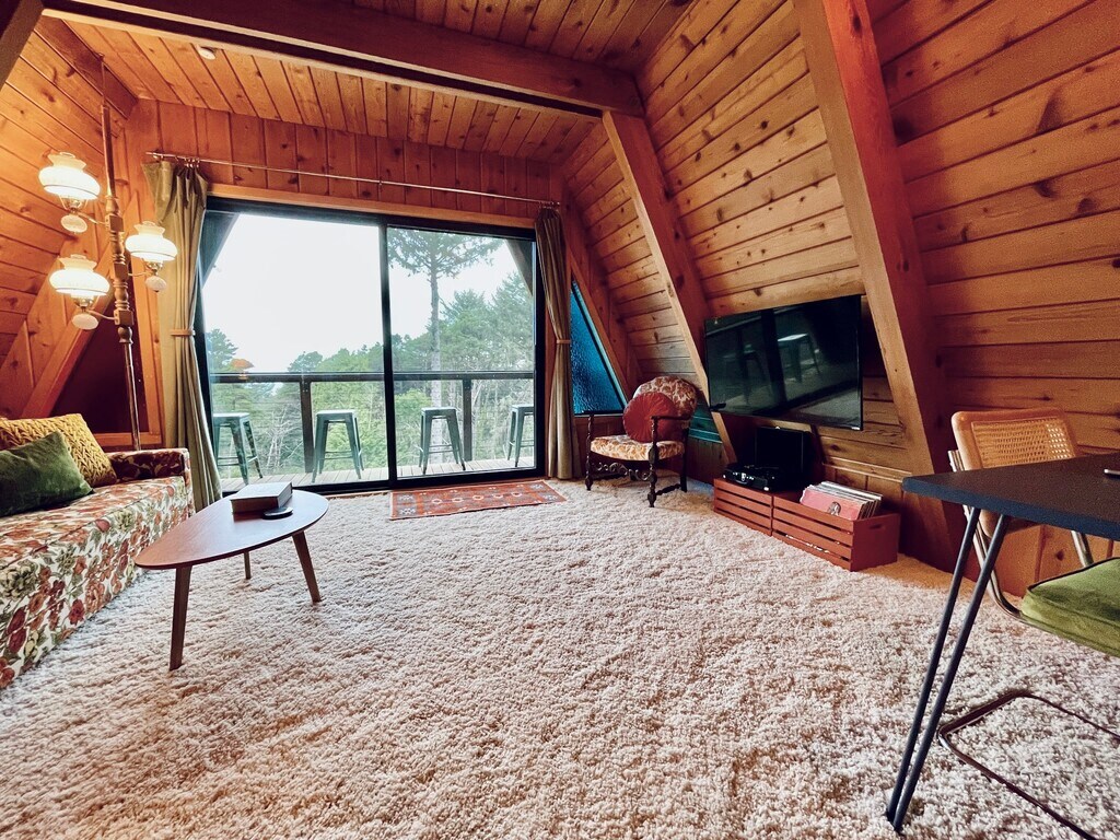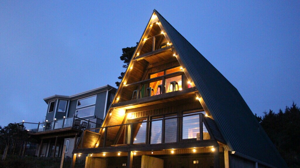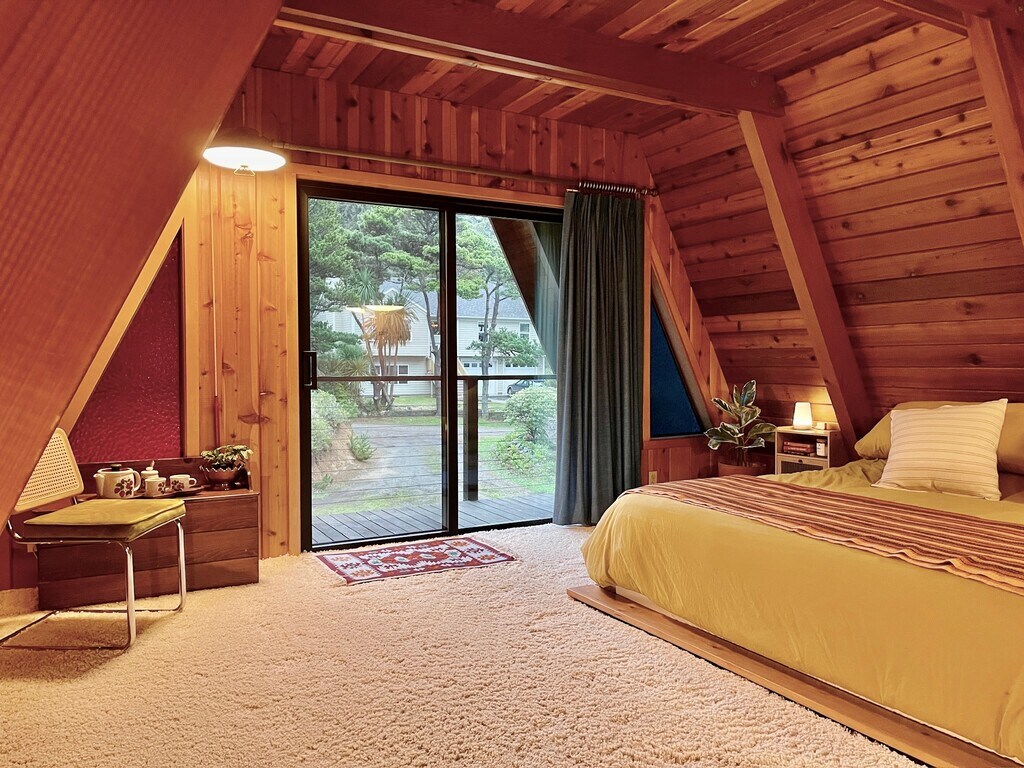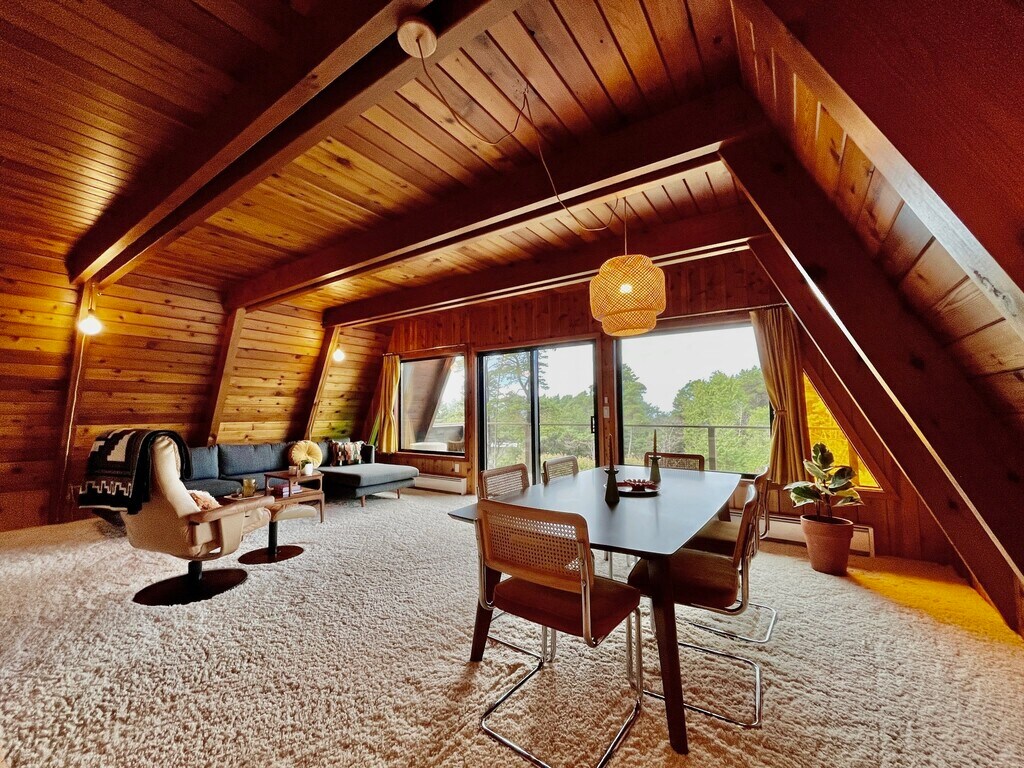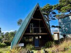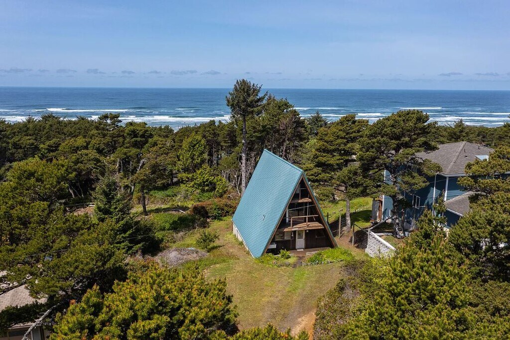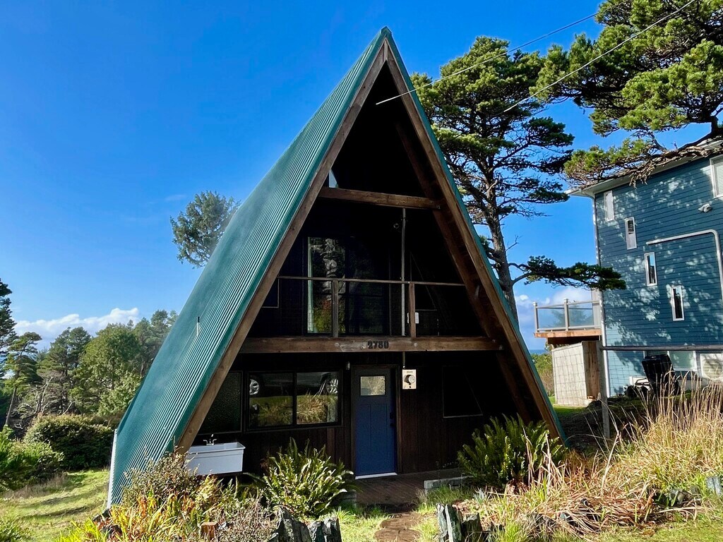 Welcome to the fabled Oregon coast. Featured in Portland Monthly magazine, this ocean view A-frame cabin is nestled between the quaint coastal towns of Waldport and Yachats, where the forest meets the sea. This A-frame was built in 1971 by the Kimball Brothers Lumber Company. All structural and panel lumber was handpicked from their mill in the Willamette Valley. Main floor includes full bathroom, laundry / mud room, bonus room with closet, kitchen with new appliances and living/dining room with sliding door to the deck with views of a coastal forest and the Pacific Ocean. Upstairs includes 2 bedrooms with slider access to decks in each, and a 1/2 bath. Ocean view second story deck has bar counter for the ultimate work from home experience and sunset cocktail. The A-frame cabin has reliably fast internet with UPS backup for the remote worker and is less than 25 minutes from all city amenities and pristine world-class outdoor recreation. This unit is available for lease terms between 3 and 12 months.