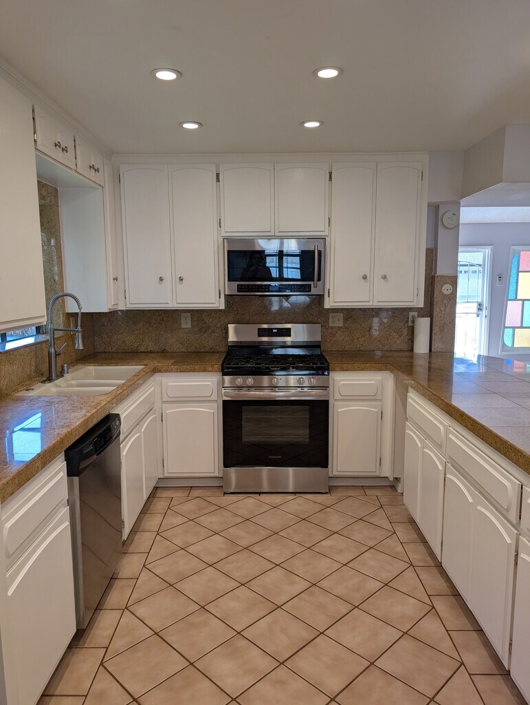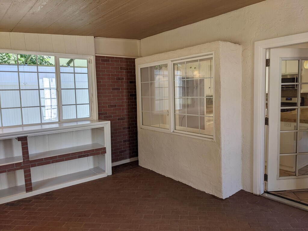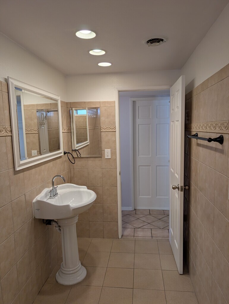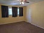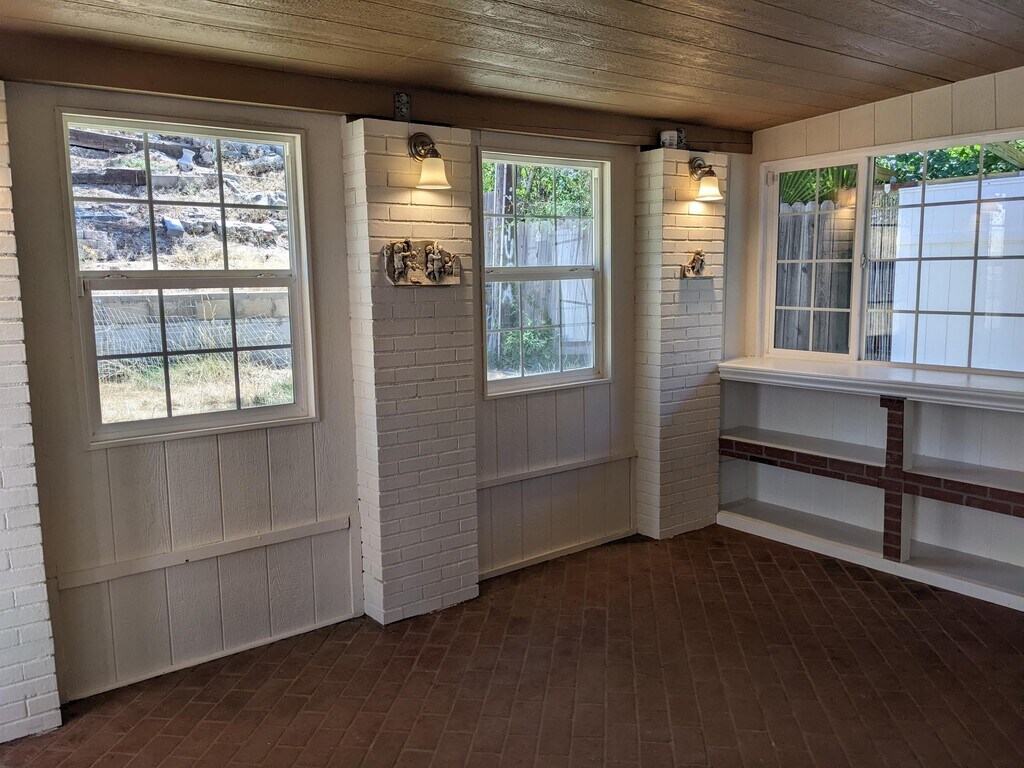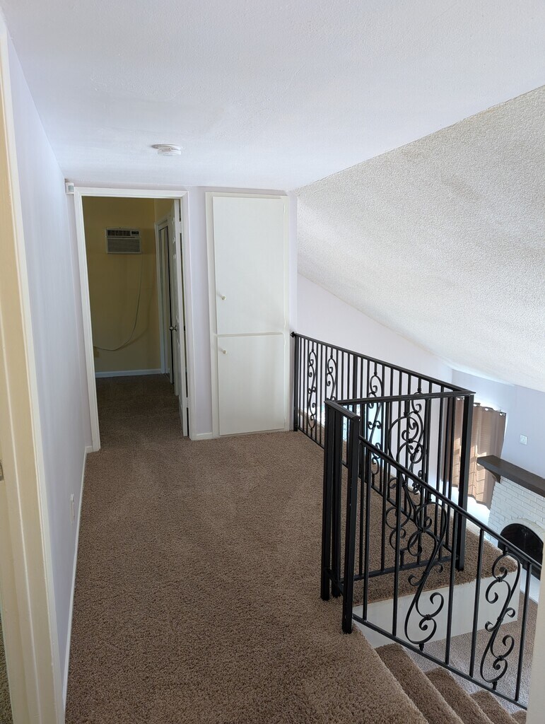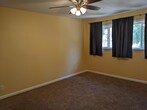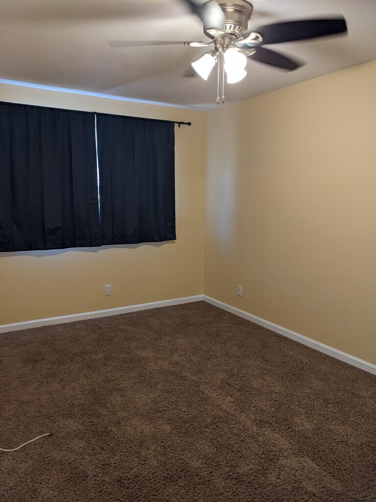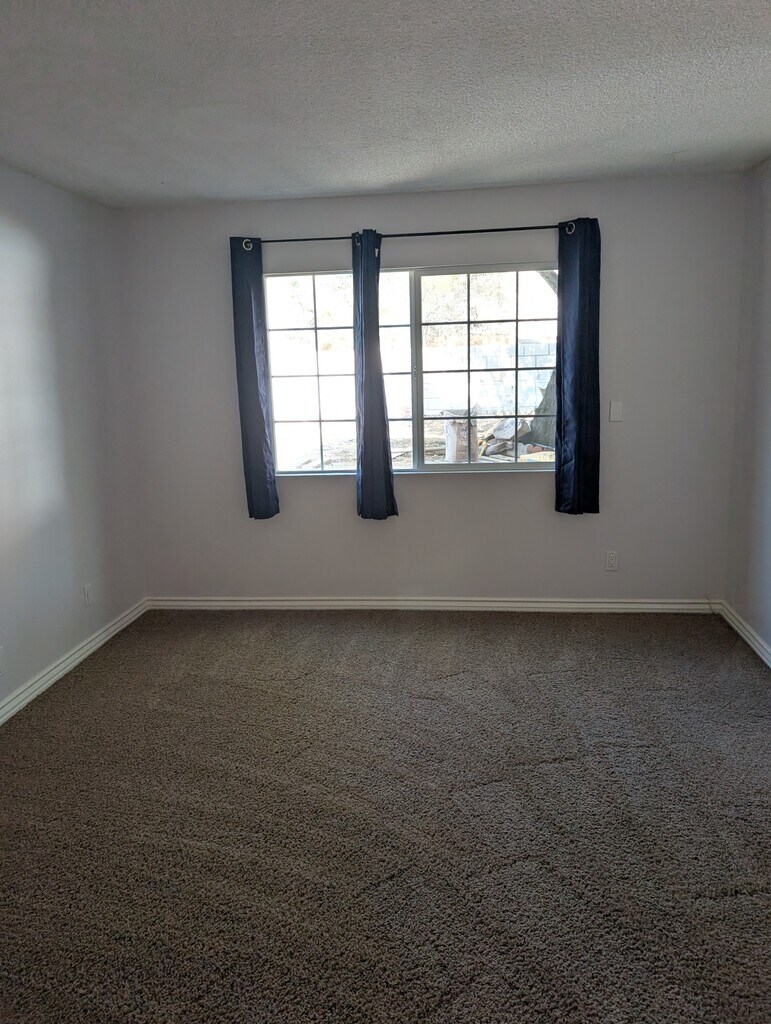 4-bedroom 2-bath home with a large bedroom and 3/4 bathroom downstairs. The bathroom downstairs features a large shower. Upon entering from the front door, you have an entryway with tile floors. To the right is a spacious family room with ample natural light and a fireplace. Beyond the family room, you have a large area that could be used as a dining room or office area. The kitchen is spacious and open, with ample counter space. Off the kitchen, you have a large, enclosed patio with lighting and storage. Down the hall is access to the two-car garage and the large bedroom. The downstairs bathroom features a large shower and is conveniently located adjacent to the bedroom. Upstairs, you have three rooms and one full-size bathroom. The largest of the rooms has an additional wall, an AC unit, and a fan. The second largest room connects to the hall bathroom. There is also a small loft area. The front yard is low-maintenance and water-conscious. The large backyard will feature a small patio area, artificial grass, and a new gate. The large hillside behind the home offers privacy. The owner will consider pets, but an additional security deposit will be required.