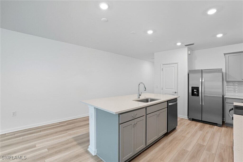 Welcome to the Alder floorplan,a beautifully upgraded home in Solis Grande offering 3 bedrooms,2.5 bathrooms,and a 1-car garage. Available for immediate move-in,this never-lived-in home allows you to enjoy all the benefits of new construction. Step inside to an inviting foyer that opens into the kitchen,featuring an eat-in island,designated pantry,and Whirlpool stainless steel appliances. Stylish grey cabinetry is paired with sleek quartz countertops,and luxury vinyl plank flooring runs throughout the main living areas for a clean,modern finish that blends durability with design. The spacious living room is bright and open which is ideal for both entertaining and everyday living. Upstairs,the generous owner’s suite provides a private retreat,while two secondary bedrooms - each with its own walk-in closet,offers comfort and flexibility for family,guests,or a home office. Additional thoughtful features include impact glass windows,extra storage space,a full smart home package,and the peace of mind that comes with living in a gated community. Solis Grande is ideally located in Bonita Springs,just minutes from I-75,making commuting north to Naples or south to Fort Myers effortless. Everyday conveniences including shopping and dining are right around the corner,and the highly anticipated Midtown Bonita development will soon bring even more restaurants,retail,and entertainment to the area.