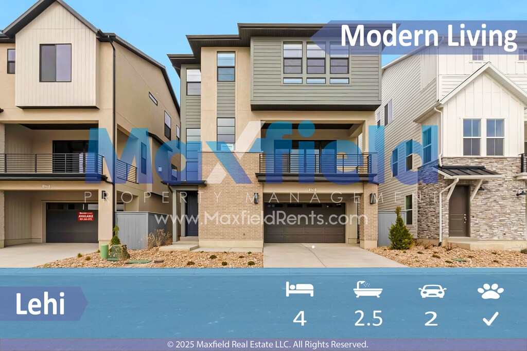 Welcome to this Modern 4BD 2.5 BTH Home in Lehi, UT! This stunning house features a spacious layout with 4 bedrooms and 2.5 bathrooms, perfect for comfortable living. The kitchen is equipped with stainless steel appliances, a gas stove, and a dishwasher, making meal prep a breeze. Enjoy the convenience of central air and air conditioning, as well as the cozy fireplace in the living room. The master bedroom boasts a private bathroom and a closet organizer for added storage. With a 2 car garage, fenced patio, balcony, and hardwood floors throughout, this home has everything you need for modern living. Also includes washer and dryer, don't miss out on the opportunity to make this beautiful house your new home! PETS: small pets considered with additional deposit and monthly pet fee based on pet. Visit for more info. No Smoking or Vaping on the Property Showing by appointment only, to schedule a showing visit or call our Showing Hotline at , option 1. Tenant Monthly Recurring Charges: * Advertised Rent; and * All Utilities (utilities vary by property and tenant usage) * Resident Benefits Package of $30 * $75 Community Fee that includes: Landscaping, Common Area Maintenance Residents are required to maintain a $100K Tenant Liability Insurance (PDLW) for accidental damage arising from fire smoke explosion, water discharge or sewer backup caused by negligent acts or omissions. Personal renter's insurance is recommended but not required. Tenants will be charged $17.00 per month if they do not have the PDLW with their renter’s insurance. Prior to move-in, tenants are required to pay a Refund Eligible Cash Security Deposit as advertised (typically one month’s rent) or have the option for using our Deposit Alternative. We offer Obligo, which lets you skip paying a security deposit in exchange for a small non-refundable monthly fee. There is also a one-time Lease Initiation Administration Fee of $150. All applicants over the age of 18 must fill out a separate application and there is a limit of 3 unrelated individuals and 2-3 vehicles depending on the unit. Beware of rental fraud and scams and from persons claiming they are getting rid of a property management company or use a google voice number. Please visit for more information. For a list of qualification guidelines please visit Download our app at All information is deemed reliable but is not guaranteed and subject to change. Photos may be of similar units if a multi-family property. Property offered through Maxfield Property Management. We are committed to equal housing opportunities and provide housing opportunities regardless of race, color, religion, sex, national origin, physical or mental disability, or familial status. We Do Business According to the Fair Housing Law.