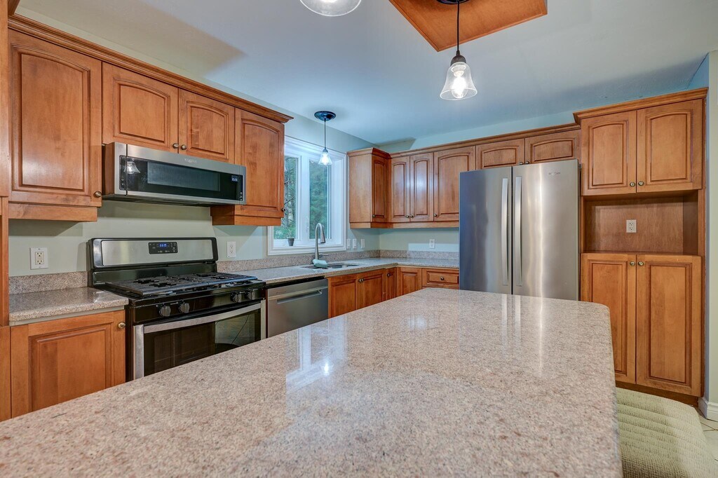 Year-round rental. A beautiful home nestled in the coveted Eidelweiss neighborhood, framed by the tranquil Pea Porridge Ponds. This home offers an open, airy main level with rich hardwood floors and a chef-inspired kitchen featuring stainless steel appliances, a gas range, and a generous island perfect for entertaining. Step from the dining area onto a spacious deck overlooking a private backyard and the gentle Babbling Banfield Brook, creating a serene and picturesque setting. Upstairs, the primary suite provides a peaceful retreat with a spa-style bathroom, including a jetted tub and separate shower, while two additional bedrooms and a full bath accommodate family or guests. The finished basement serves as a flexible space for a home gym, studio, or hobbies. Additional highlights include a two-car garage connected by a covered breezeway, on-demand hot water, and a welcoming covered front porch with colorful perennial gardens. Ideally located, you’re just minutes from sandy beaches, kayaking, fishing spots, Silver Lake, ski resorts, and the shops and restaurants of North Conway. Credit/background/application fee required. MLS# 5070400