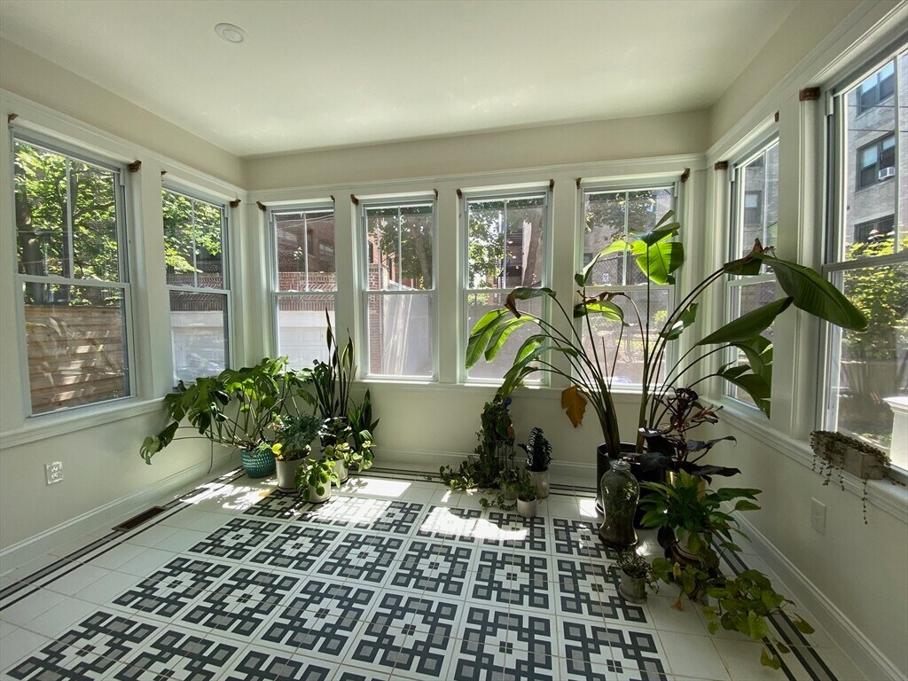 Recently renovated single level,3 bedroom,2 1/2 bathroom home features an open living,dining and kitchen with fabulous natural light and hardwood floors throughout. The modern,open kitchen has a large pantry closet,beautiful gray lower cabinets,white uppers,stone countertops and backsplash with counter seating for three. Stainless steel appliances with gas cooking,vent hood,and pot filler. Off of the kitchen is a light filled sunroom with wrap around windows and custom graphic tile floor. Three generous sized bedrooms,including a primary with en suite bath and enormous walk-in closet. Additional features include in unit washer/dryer,central air conditioning,garage parking w/ door opener and keypad security,common backyard,and enormous basement storage space. Tenants responsible for all utilities,no smoking and no pets allowed. Option to end lease May 31,2026 or Aug 31,2026. MLS# 73434028