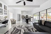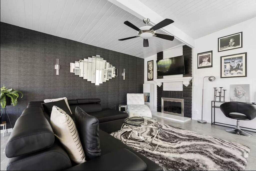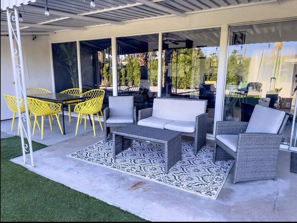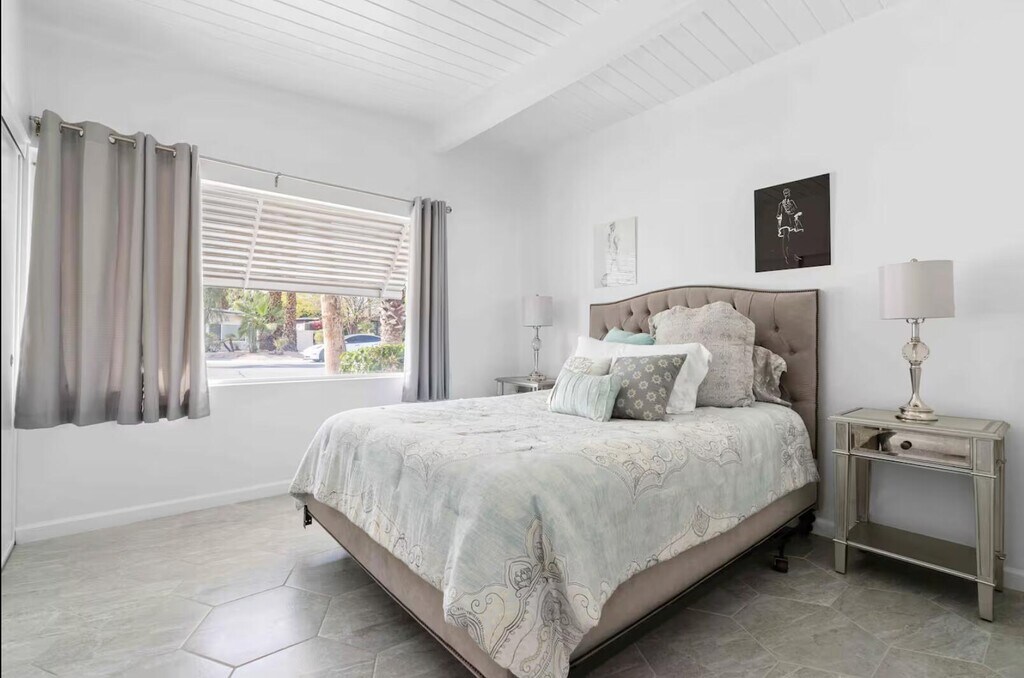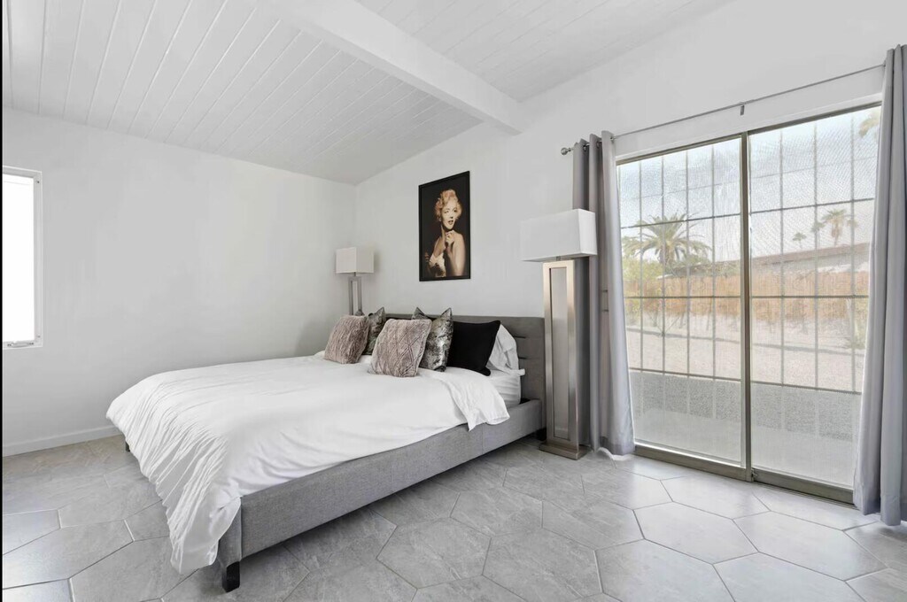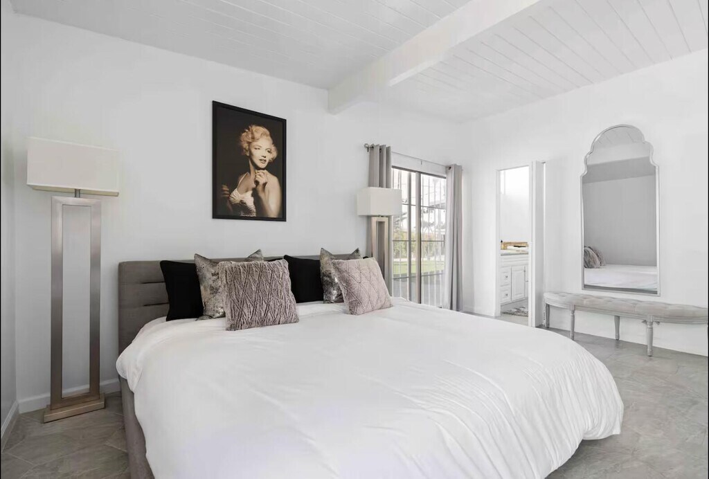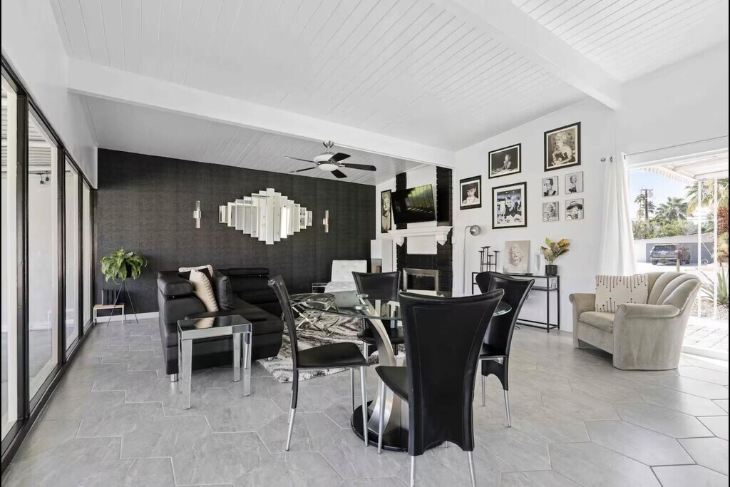 Now available for seasonal or long-term lease (currently all dates are available),this move-in-ready 3-bedroom,2-bathroom Marilyn-themed Palm Springs home comfortably accommodates up to six guests and offers a fun,family- and pet-friendly stay without the worry of a pool. The open living area features a fully stocked kitchen and a bright living room overlooking the spacious backyard. The primary suite includes a king bed and private bath,while two additional bedrooms offer queen beds and share a guest bath. Enjoy the large private backyard with lawn games and a ping pong table,plus garage access for convenience. Centrally located near shopping,dining,and downtown Palm Springs. Pets are welcome