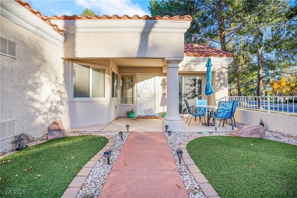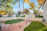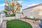 Beautiful Townhome located in Sun City Summerlin. This home sits on a corner lot with huge trees, lots of grass, giving you a perfect opportunity to enjoy a large enclosed patio (even see a part of the golf course across the street). Inside you will enjoy this freshly painted home w/upgraded large tile layer on the diagonal going through most of home, a large and open living room, formal dining room w/ pass through counter into the kitchen, an enclosed porch complete with fan, kitchen w/ pantry & stainless steel appliances (including fridge) & a door leading to enclosed front porch. Primary bedroom contains darker laminate floor, walk-in closet, and full bath. Secondary bedroom is set up to be used as a den also w/ built-in desk and decorative french doors, and a walk-in shower for secondary bath. Garage features plenty of built-in cabinets. Come enjoy all that Sun City Summerlin has to offer w/ all the clubhouses, golf courses, social activities, pools, courts and much much more.