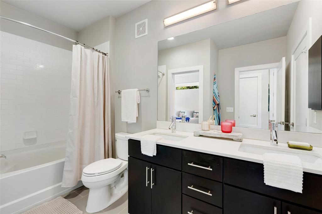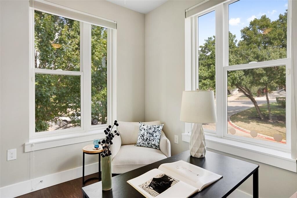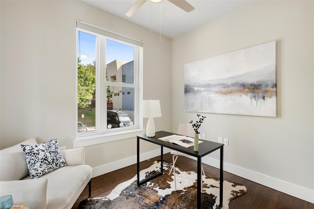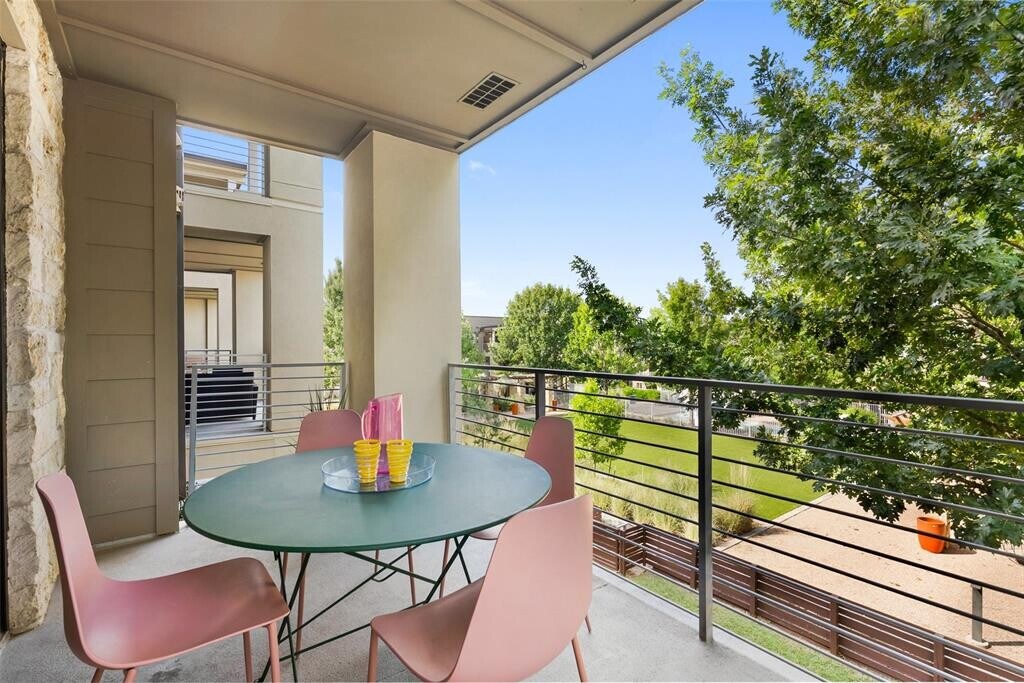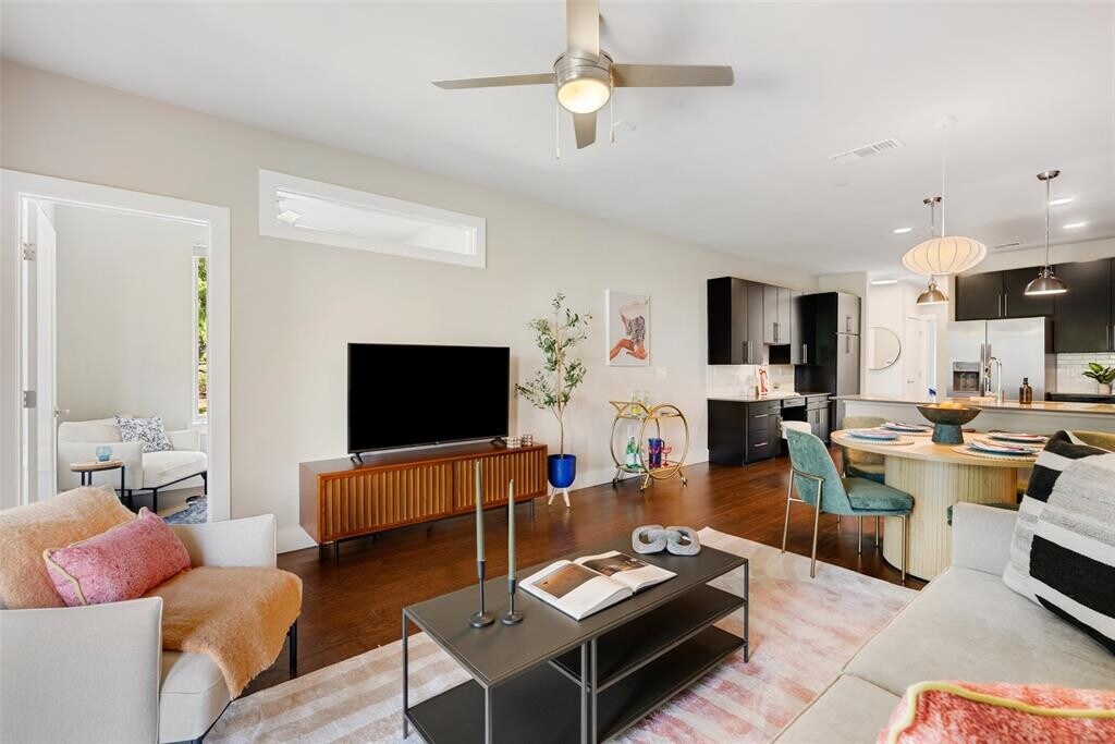 Discover modern South Austin living at The Denizen in this end-unit condo. Offered for the first time and carefully maintained by its original owner, the home lives much larger than a typical 1-bedroom thanks to a versatile den, perfect for a home office, guest space, or studio. Natural light streams in from windows on three sides, highlighting the open layout and hardwood floors throughout (no carpet). The kitchen is modern and functional with gray quartz counters, stainless steel appliances, ample storage, and a built-in desk area. The primary suite includes hardwood floors and a generous walk-in closet. Its private bath features a double vanity with white quartz counters and in-unit laundry. Freshly painted throughout, the condo also offers a private patio with pool and downtown views, an outside storage closet, and one reserved parking space. Community amenities include a sparkling pool, clubhouse, two dog parks, outdoor kitchen with BBQs, bike storage, and an amphitheater, plus 3.5 acres of green space to enjoy. On the north end of the community, the South Austin Community Park adds even more with open fields, tennis courts, pickleball courts, trails, and more. Prime 78704 location means you’re minutes from South Congress, South Lamar, and Downtown, with local favorites like Summer Moon Coffee, Elizabeth St. Cafe, Polvo’s, and Bouldin Creek Cafe nearby. Zilker Park and the airport are both just a short drive away. This home combines flexible living with lock-and-leave ease and access to Austin’s vibrant culture and lifestyle. STR not allowed.