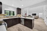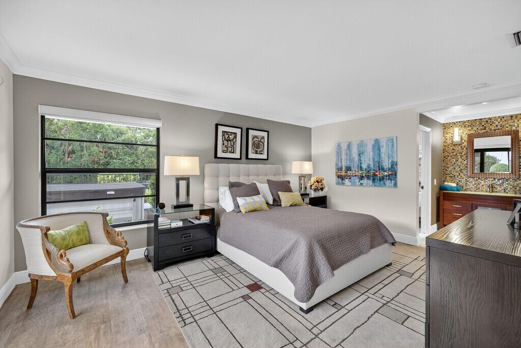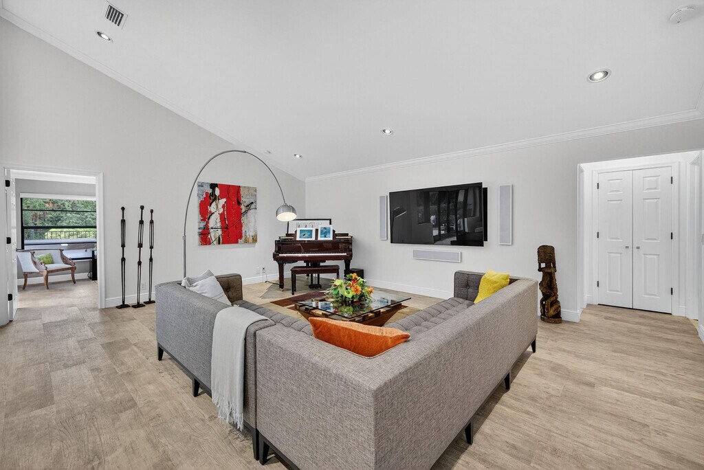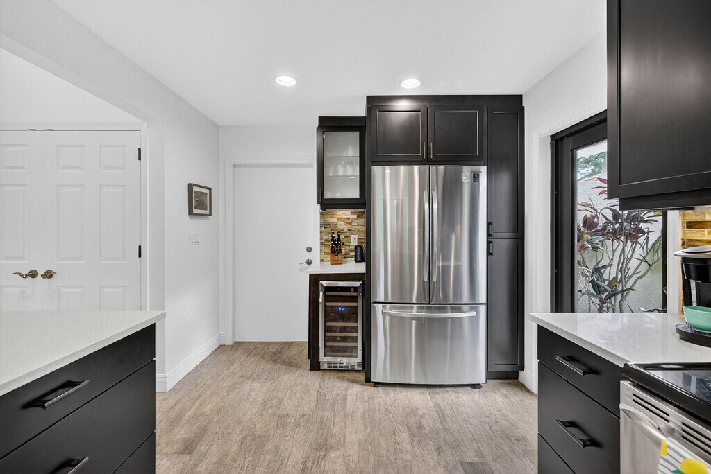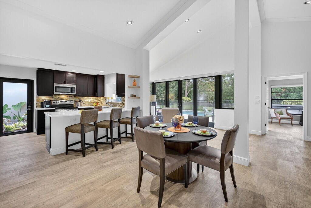 Waterfront POOL HOME W/ 2 CG IS FULLY FURNISHED! Step inside through a welcoming foyer into a wide-open floorplan featuring contemporary ceramic tile flooring,elegant 4" baseboards,& soaring 14-foot ceilings w/ knockdown finish. The great room layout flows effortlessly into a stylish chefs kitchen complete w/ Samsung S/S appliances,granite countertops,36 coffee colored shaker cabinetry w/ crown molding & Farmhouse sink. Convenient pass-through to the enclosed Florida room. The primary suite is generously sized w/ a king-sized bed & a sitting area. It includes a large walk-in closet & beautifully updated ensuite bathroom featuring counter-height vanity w/ undermount sink,frameless glass shower & ceramic tile. Tumbled marble flooring for a spa-like feel. Big guest room. SPA to relax. MLS ID F10520897