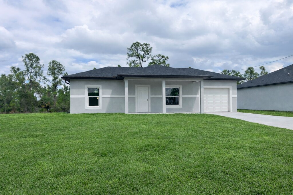 Introducing our NEW CONSTRUCTION - a modern 1 Bed / 1 Bath Home in the heart of Lehigh Acres, FL. This stunning home boasts a sleek design with beautiful tile flooring throughout and an abundance of natural lighting. The kitchen is a chef's dream, complete with granite counters, wood shaker cabinets, and a full suite of stainless steel appliances. The primary bedroom is a true retreat, featuring an en-suite bathroom for added convenience. The home also includes a one-car garage and a washer and dryer hook-up. The exterior is just as impressive with storm protection-impact windows and a covered rear lanai, perfect for enjoying the Florida weather. This brand-new construction is conveniently located close to all amenities in Lehigh Acres. Don't miss out on this gem - SEE IT TODAY! Photos may not be of actual model- for marketing purposes only.
