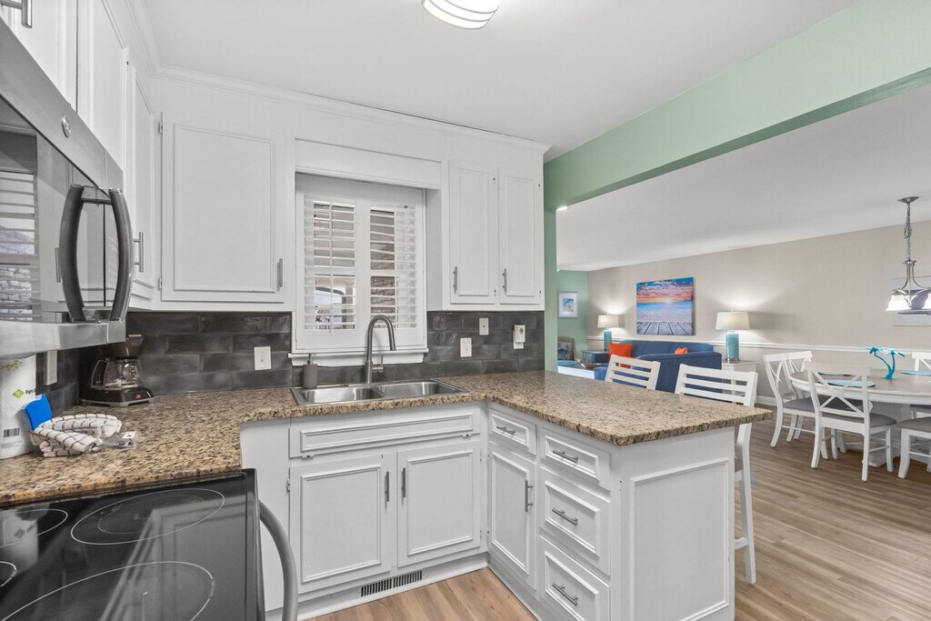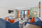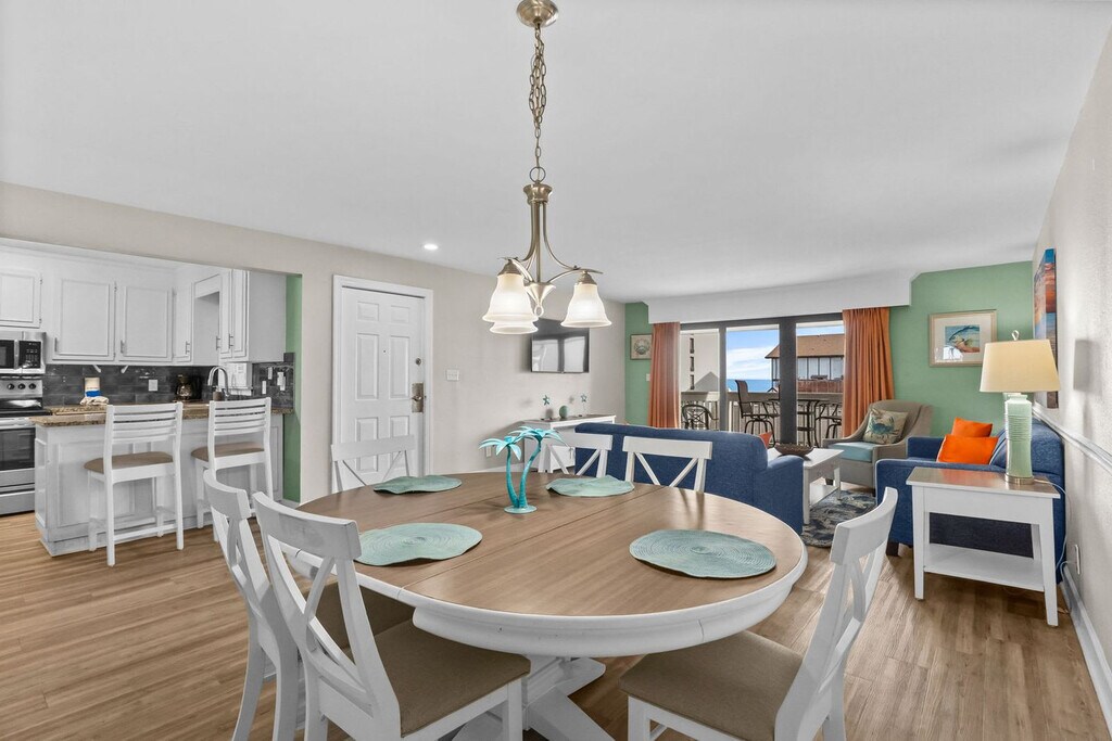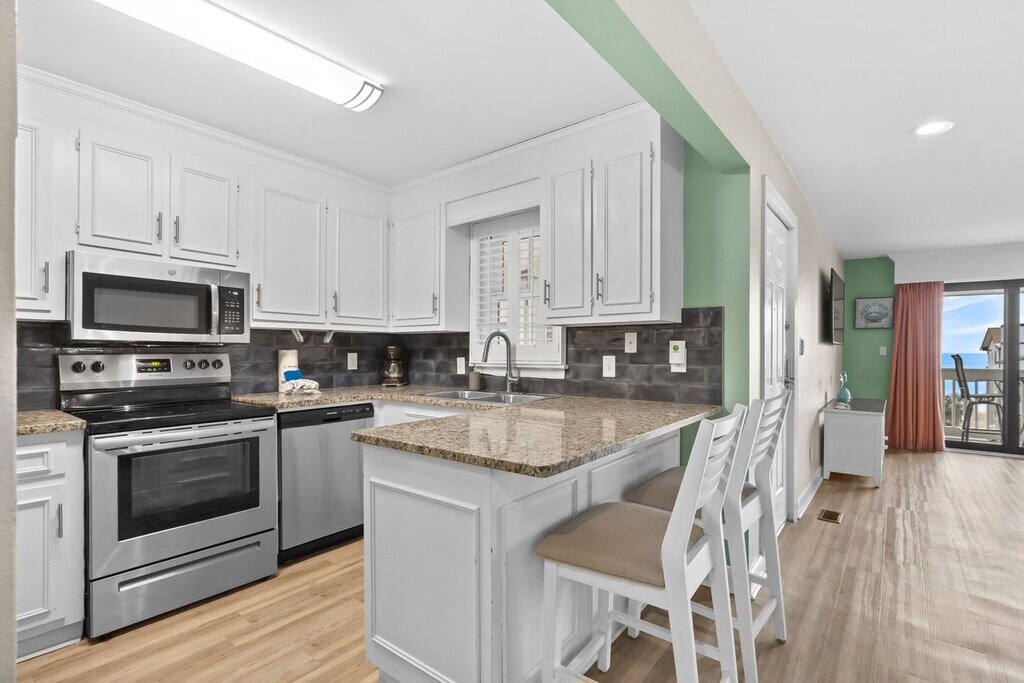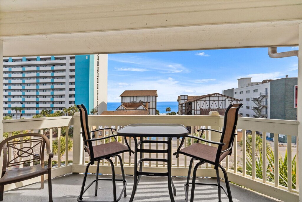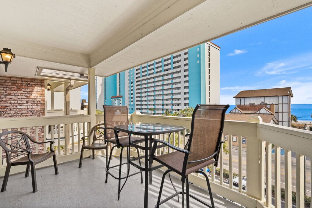 Feel at home in this well-kept, updated, and modern condo on the 3rd floor of a building with arguably the best views in the community. Located in the heart of Myrtle Beach, this apartment is directly across the street from a public beach access point and only a few blocks from Broadway at the Beach, the Myrtle Beach Boardwalk, and the Convention Center. The open floor plan living and dining areas are spacious and tastefully appointed with plenty of seating. There is a 55" flat-screened TV, queen sleeper sofa and separate loveseat, a large dining table seating 6, and an additional dining table on the ocean-facing covered balcony. The fully stocked open kitchen features stainless appliances and granite countertops. The primary suite has a queen-sized bed, a twin bed, a large closet, a 40" flat-screen TV, a beautifully updated en suite bathroom, and private balcony access. The second bedroom also has two twin beds and back balcony access with additional seating. Back entrance to the pool and hot tub deck is accessible from the back balcony. A car is recommended, but you can also walk several places. Uber is available in the area, but can be limited at times. Backpack-style beach chairs are available. Located directly across the street from the public beach access at 29th Avenue North in Myrtle Beach, this apartment is super close to all that Myrtle Beach has to offer both on the water and inland. Starbucks and Ben and Jerry's are across the street, the renowned Sea Captain's House with ocean front bar is a 3-block walk away, and you will be less than 1 mile from Broadway at the Beach, the Myrtle Boardwalk, and the Myrtle Beach Convention Center. Quiet hours are between 11 pm and 7 am as per citywide ordinance. Please consider your neighbors and keep noise at a reasonable sound level. The property is non-smoking, and pets are not permitted. By state law, occupancy may not exceed 6, and maximum occupancy includes infants and children. Quiet hours are between 11 pm and 7 am. Please treat our home and common areas with the same respect as you would your own. Pool hours are from 9 am to 10 pm. No glass or pets are allowed in the pool or surrounding enclosure. No children under 12 years of age are allowed in the pool without a parent or guardian. Portable grills are not permitted on the balconies or patios. All garbage should be firmly secured in bags and deposited in the dumpsters located on 29th Ave. N just to the West of the main parking lot and across from Starbucks. No flammable fluids such as kerosene, explosive or flammable materials or any other articles deemed hazardous are permitted in units. Please do not obstruct common areas with bikes, floats, chairs, etc. No boats, trailers, or oversized vehicles shall park in the lots. Check-in is from 4:00 to 10:00 PM, and check-out is at 10:00 AM. There is a minimum age requirement of 25. [SI]