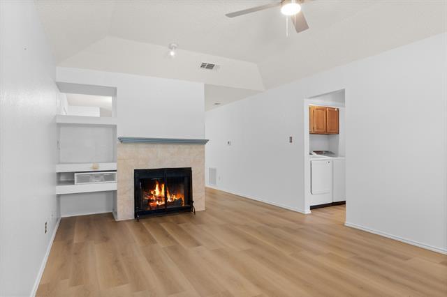 This charming, spacious duplex is nestled on a cul-de-sac in the highly sought-after GCISD school district*Beautifully updated baths, fresh paint, & luxury vinyl plank flooring throughout*The heart of the home is the chef’s dream kitchen complete with granite countertops, generous counter space, an island with breakfast bar, professional-grade vent hood, glass cooktop, large sink, dishwasher with upper and lower arms, high-quality soft-close cabinetry, pantry with pull-out shelves, and plenty of storage drawers*A vaulted ceiling and lots of light make the eat-in space inviting, and the TV in the kitchen stays for your enjoyment*Relax in the living room with its cozy wood-burning fireplace and built-in shelving, or retreat to the primary suite featuring a walk-in closet and ensuite bath with a multi-jet shower*Ceiling fans in living room, bedrooms and dining room connected to the kitchen*Enjoy the outdoors under the shade of a mature live oak tree on the patio, with extra storage options including free-standing shed and an outdoor closet with shelves and pegboard*Attic has additional storage space*A covered carport with additional gated parking is also included*Locking storm door with ventilation option at back entrance*Pet lovers will appreciate the unique catio—a shaded outdoor confined play area connected to the kitchen window for your cat or small dog (removable if preferred)*3-ton Trane AC (only 2 years old)*Large-capacity washer with waterproof cycle, dryer & refrigerator, all recently purchased, included*Conveniently located near shopping, award-winning schools, restaurants, entertainment, DFW Airport and easy access to Highways 114, 121 and 360. Thoughtful features make this home a rare find. Tenant requirements: Minimum credit score 650 and verifiable monthly income of $5,700*Tenants and agents to verify schools and square footage.