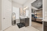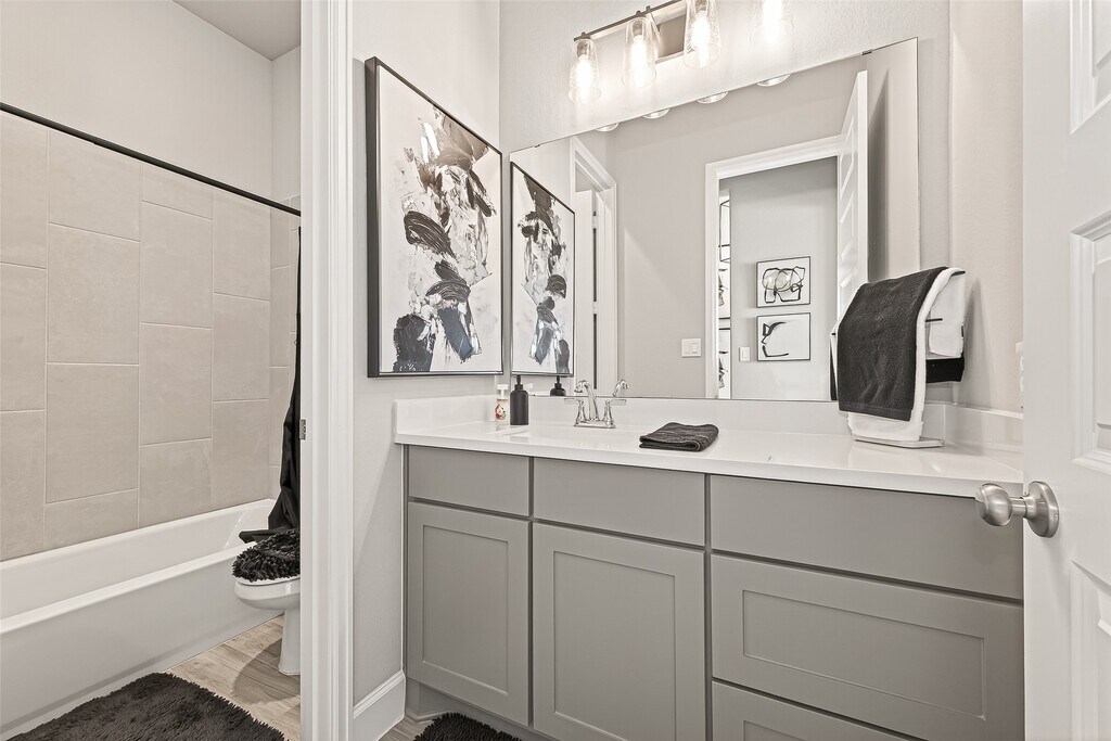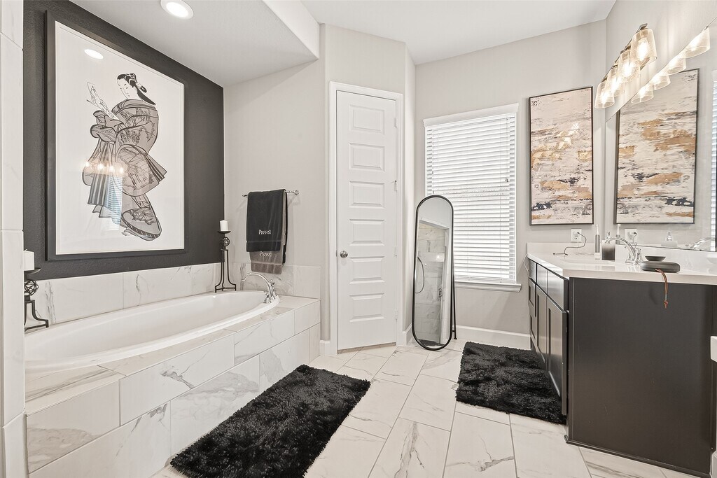 This,two years old,house offers great living space features a home office,media room,dining room open to the living area with a fireplace. The kitchen has a walk-in pantry. The primary suite includes double-door entry to primary bath with dual vanities,garden tub,separate glass-shower and two walk-in closets. A guest suite offers private bath. High ceilings and abundant closet space. An extended covered backyard patio adds an outdoor living experience. There is a mud room off three-car garage. Close to a HEB and other shopping. The furniture in the photographs belong to the previous tenant. MLS# 40613968