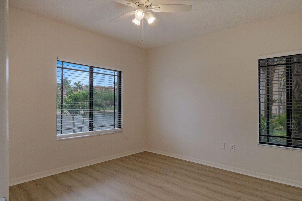Lovely two-bedroom two bath, corner unit available December 1 2025. Wood-look vinyl floors in living area and bedrooms. Full size washer and dryer. Screened in patio with east expose with a lovely lake view. Hurricane shutters for bedroom windows and slider. Community amenities include swimming pool, playground, clubhouse, sauna, gym and steam room. Extremely close to Gardens Mall, downtown at the Gardens, restaurants, various shops and access to I-95 and turnpike. Approximately 20 minutes to Palm Beach Int'l airport. San Matera is a great place to live; call today before it's gone. 630 minimum credit score to be approved for occupancy per association rental guidelines.