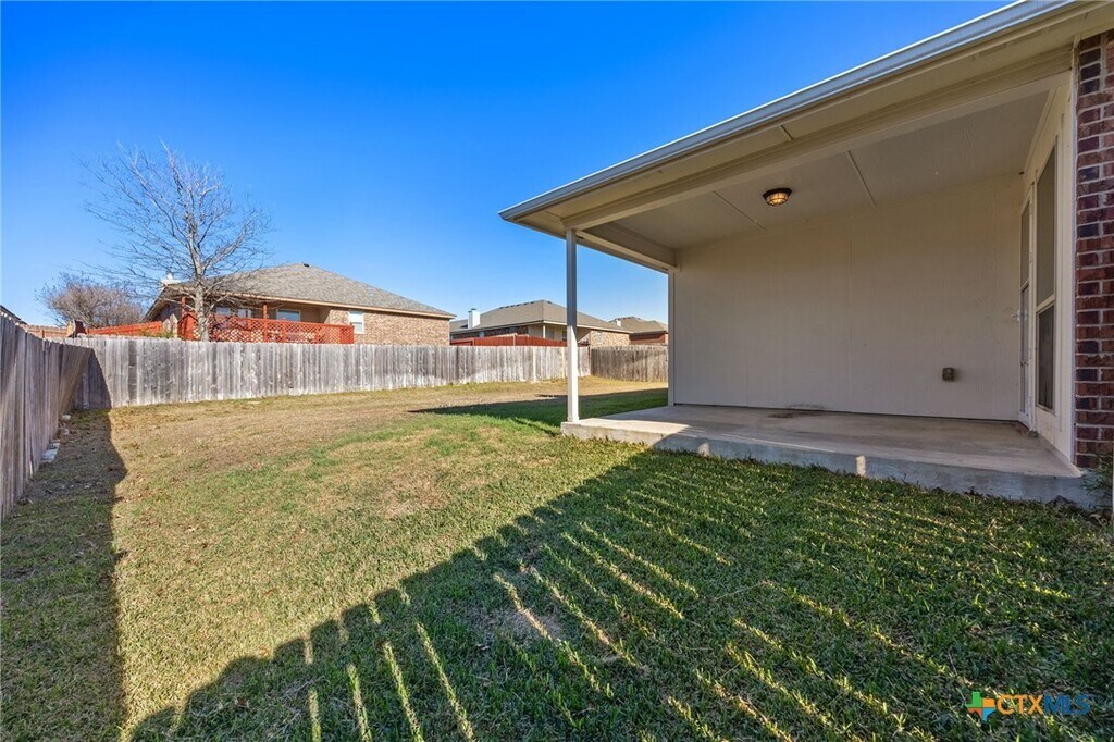 This 3 bedroom,2 bath home in Goodnight Ranch offers a practical layout with a dedicated laundry room and a fenced backyard with a covered patio for outdoor use. The kitchen features granite counters and black appliances,while the primary bathroom includes a separate shower and a double vanity. Thoughtful finishes and outdoor space make this property a comfortable option in Killeen,TX.