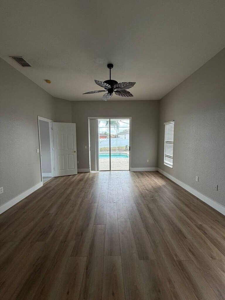 This beautifully spacious 4-bedroom, 2-bathroom home with a 2-car garage offers the perfect blend of comfort, functionality, and outdoor living. Built in 2000 and located in a desirable neighborhood, this home is ideal for families or anyone looking for space and convenience. Step inside to an airy, open layout with generous living areas designed for both everyday living and entertaining. The family room, dining room, and primary bedroom all feature sliding glass doors that lead directly to your backyard oasis, creating seamless indoor-outdoor living. Enjoy your own private screened-in pool area, complete with a large covered seating space, perfect for hosting gatherings or relaxing year-round. The fully fenced backyard provides added privacy and security. Conveniently located near top-rated schools, Valleyview Elementary is within walking distance, and George Jenkins High School is just minutes away, making this home as practical as it is beautiful. Rental Details: Monthly Rent: $2,825.00 Security Deposit: $2,825.00 Lease Term: 12 months minimum Utilities: Tenant responsible for all utilities & lawn care. Pool Maintenance INCLUDED. Pet Policy: $300 non-refundable pet fee (one-time) Application: Fee of $75 per adult for Background & Income Verification required