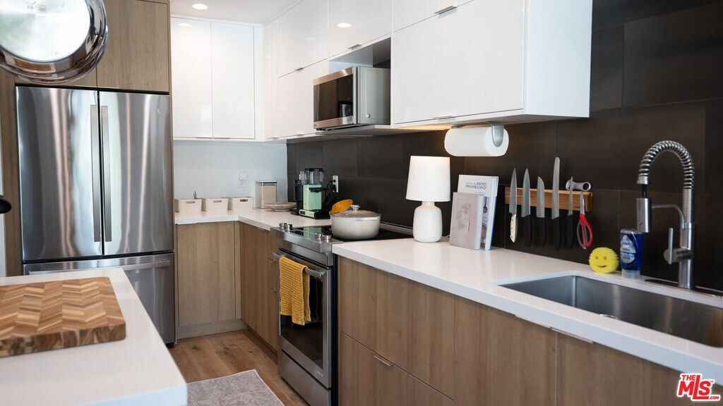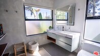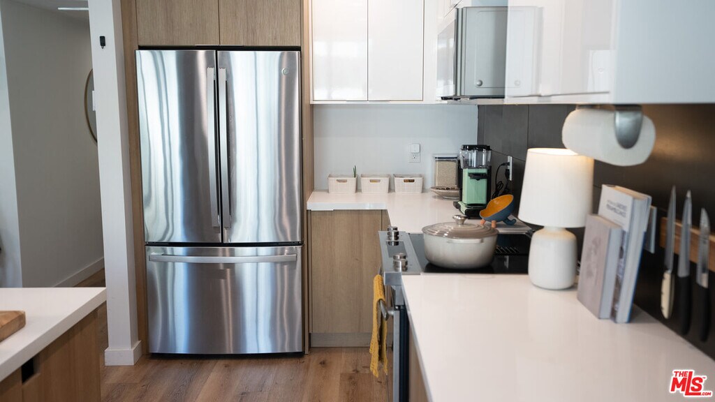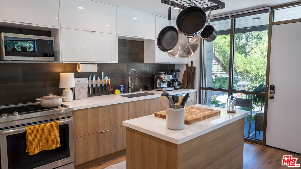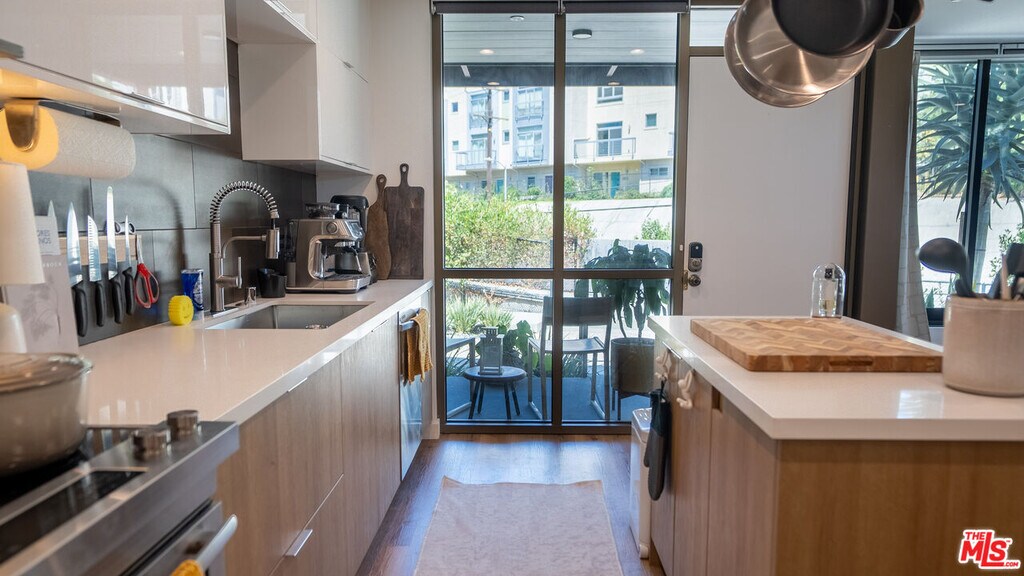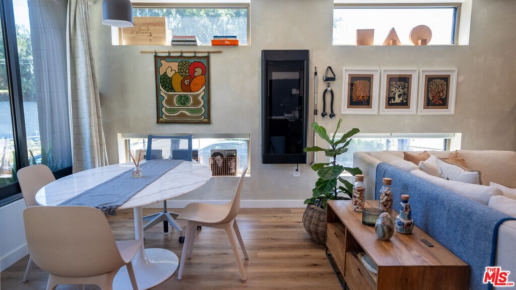 Located in one of Silver Lake's few truly architectural mid-century buildings, this fully reimagined 2-bedroom, 2-bath residence offers thoughtful design and seamless indoor-outdoor living. Renovated and expanded in 2022, the home balances modern functionality with the calm, intentional feel of classic California modernism. The open living space is anchored by three oversized floor-to-ceiling sliding glass doors that connect directly to the garden, filling the interior with soft eastern morning light. Clean lines, warm materials, and intuitive layout make the space feel both expansive and comfortable. The kitchen offers exceptional storage and workspace, designed for everyday practicality without sacrificing aesthetic simplicity. Both bedrooms are well proportioned, while the primary suite features an oversized en-suite bath and generous closet space. Additional amenities include in-unit washer and dryer, two gated parking spaces with EV charging, solar, and high-speed internet included. The building is carefully maintained by an attentive owner, allowing for direct communication without the typical management company layer. Ideally positioned just minutes from the Silver Lake Reservoir and steps from neighborhood favorites including Forage, Edendale, Broom Street Coffee, Gelson's, and Whole Foods. A rare opportunity to live in a thoughtfully designed home within one of Silver Lake's most architecturally distinctive buildings. MLS# 26665173
