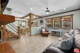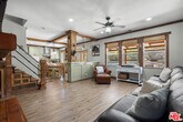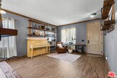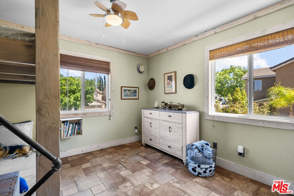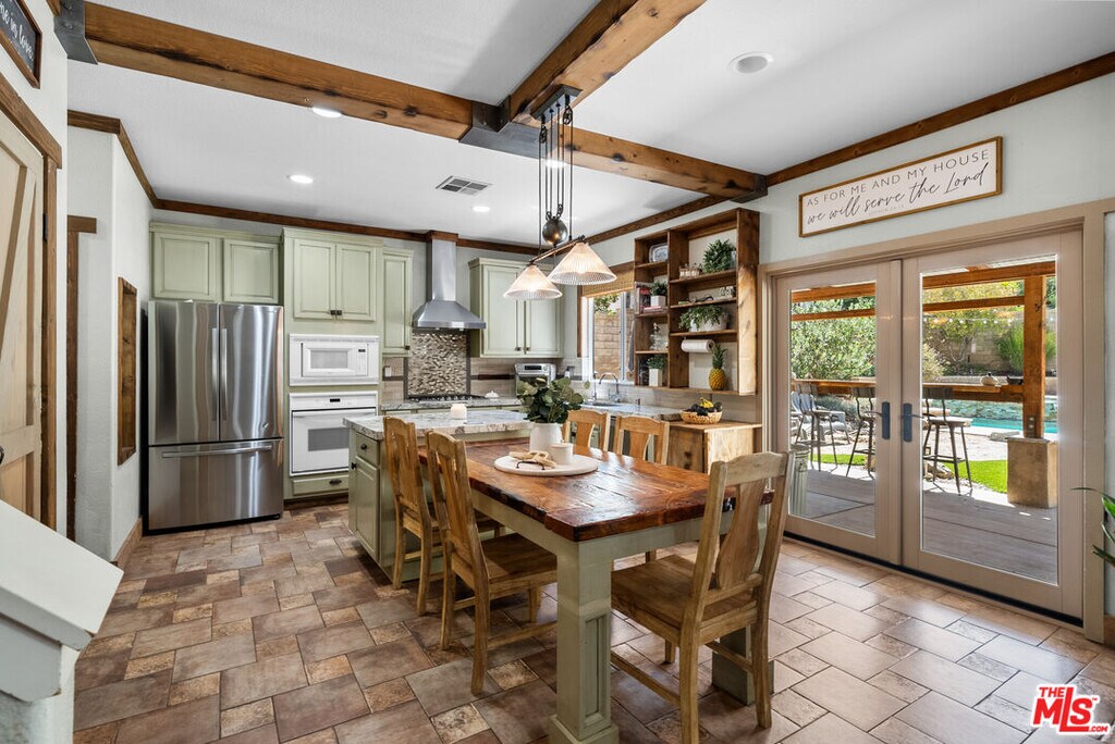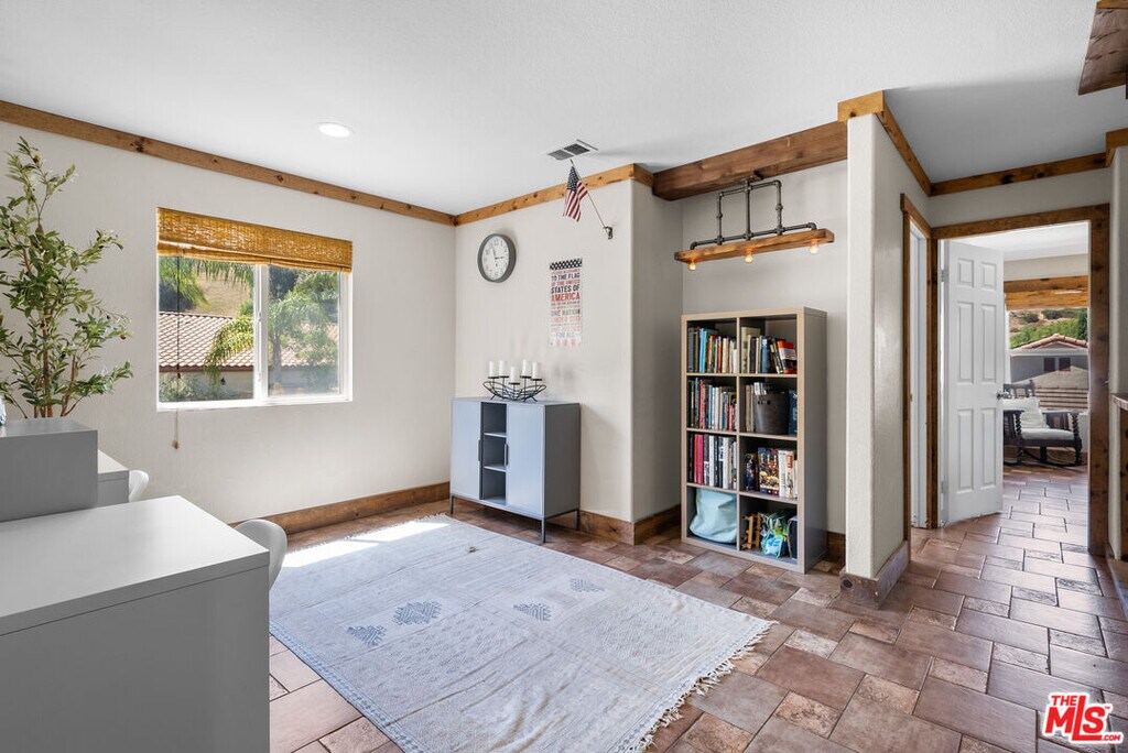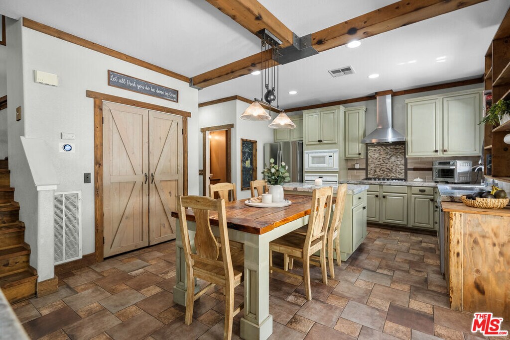 Welcome to 28123 Gibraltar Ln, where modern farmhouse charm meets thoughtful design in the heart of Castaic. This 4-bedroom, 3-bathroom home offers 2,052 square feet of inviting living space on a serene hillside lot. Step inside to discover an open-concept layout anchored by a stunning 4-sided stone ethanol fireplace that serves as the heart of the home. Throughout, you'll find warm wood beam accents, custom lighting fixtures, and light-filled spaces that create an atmosphere of relaxed sophistication. The kitchen is a true gathering space, featuring sage green cabinetry, rustic wood details, exposed beams, and charming barn door accents. Thoughtful touches include a built-in countertop workspace designed with kids in mind, while custom wood storage cabinets provide ample organization. The handcrafted dining room table anchors the adjacent dining area, which flows seamlessly into the living spaces, making everyday living and entertaining effortless. The bedrooms showcase impressive custom built-ins, including a remarkable wood bunk bed complete with stairs and handrails, plus custom shelving throughout. The bathrooms feature quality finishes including granite countertops, modern fixtures, and beautiful wood accents. Outside, your private resort awaits. Beautifully crafted french doors lead you to the backyard which showcases a sparkling pool and spa, expansive covered patio with built-in bar seating, putting green for golf enthusiasts, and low-maintenance artificial turf, all framed by hillside views. The outdoor entertaining area is enhanced by a custom-built wood BBQ unit, while the garage offers additional appeal with a custom wood bench. The backyard is truly a gem within the hillside that can keep you entertained year round. Nestled in a peaceful Castaic neighborhood with convenient access to Castaic Lake, restaurants, entertainment and quick access to freeways this home is truly a gem! MLS# 25631415