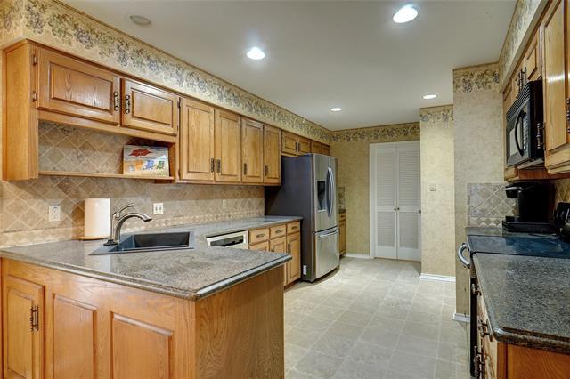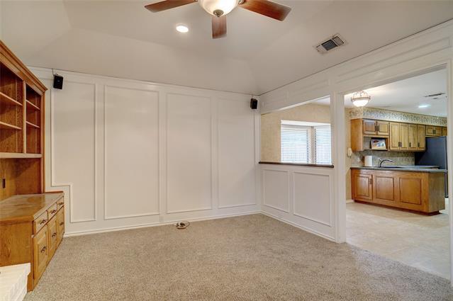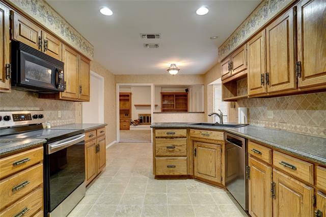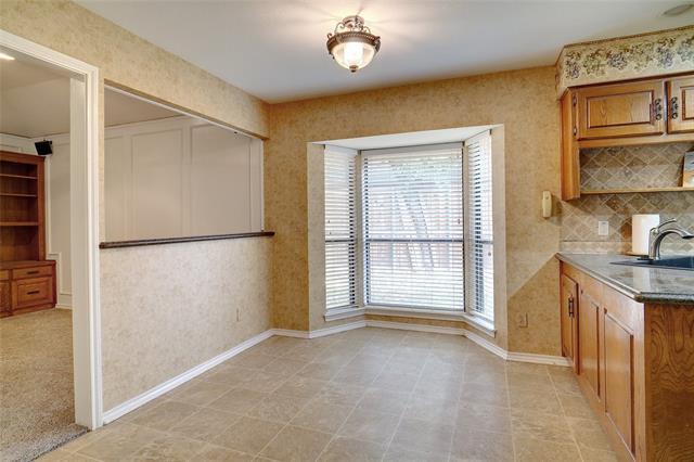 Well maintained home with south facing front, 3split spacious BRs for adult beds, bright paint & no popcorn ceilings, oversized garage for trucks, private treed backyard with under roofline courtyard outdoor living porch & extended deck, updated roof & fence. LVP wood floor extends thru dining into living & split rear master. Cathedral beam accent ceiling with skylights in spacious front living opens into bright dining & and eat in kitchen with bay window . Study options in MBR or rear Den with wall of builtins and desk. Updated master bath with long vanity, skylight, WI closet & oversized glass wall roll in shower. Kitchen has updated appliances, graphite sink, marble backsplash, ample cabinets & counter space & pantry. Utility room has 8 cabinets, sink & freezer space. Lovely side yard for garden, pets or storage. Excellent schools, quick access to Bedford Rec, sport fields, parks & hike n bike trails, DFW Airport, shopping & dining & 4 hwys.