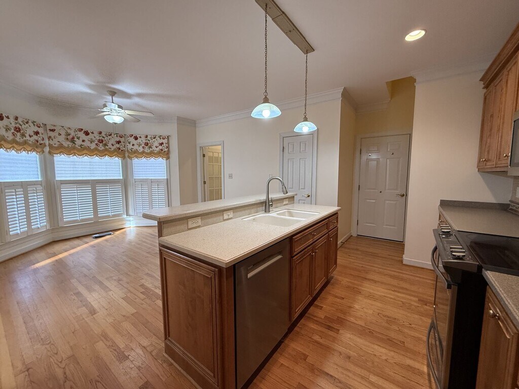 This impeccably maintained and tastefully updated end-unit townhome is located in the distinguished and tranquil Port Warwick community. The property offers effortless living within walking distance of a variety of shops, restaurants, and community events, including seasonal farmers markets, art exhibitions, live music, and holiday celebrations. The first floor features a well-appointed living room with a vaulted ceiling and gas fireplace featuring built in surround sound speakers, as well as an inviting eat-in kitchen equipped with solid-surface countertops and upgraded appliances. This level also includes a bedroom with an en-suite full bath and walk-in closet, in addition to a conveniently located half bath. The second floor comprises a spacious primary bedroom suite, a secondary bedroom, and a third full bath. A large laundry room and a walk-in attic provide substantial storage and functionality. Additional amenities include a generous two-car garage, a screened porch, and a fenced, landscaped backyard with a patio. A security system is installed, though monitoring services are not included. Front yard maintenance is provided by the HOA, ensuring minimal upkeep for the resident. Smoking is not permitted. Sorry, no pets.