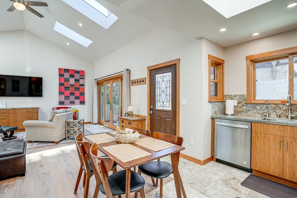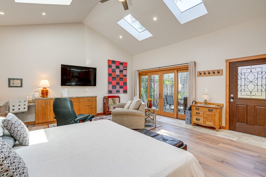 Ideally situated in the heart of Alameda, this 1-bathroom studio invites you to experience the best of the Bay Area with ease. Enjoy quick transitions from place to place as you play a round of pickleball at Lincoln Park, explore the lively waterfront attractions of Jack London Square, and tour world-famous destinations like Alcatraz Island in San Francisco. At day's end, check out a nearby local restaurant, or simply unwind with an al fresco meal on the private patio at this vacation rental. This studio features a California King Murphy Bed, a fully equipped kitchen with a fridge, stove, oven, dishwasher, microwave, cooking basics, spices, toaster, and drip coffee maker. The open floor plan includes a dining table, office space, smart TV, board games, books, and skylights. Enjoy the fenced-in patio with an outdoor dining area and umbrella. Parking is available with space for two vehicles in the driveway and free street parking. An EV charger is also available for your convenience. Located close to parks and beaches, this property is approximately 16 miles from San Francisco, offering easy access to the city's attractions while providing a peaceful retreat in Alameda. The homeowner lives on-site in a completely separate unit and may be present during your stay. This single-story unit offers step-free access and keyless entry. Smoking, events, parties, or large gatherings are not allowed. No pets are allowed due to the homeowner’s severe allergies. Guests must be at least 25 years old to book. Includes office space with a dining table and free WiFi, making it remote work-friendly. A laptop computer is not included. [SI]