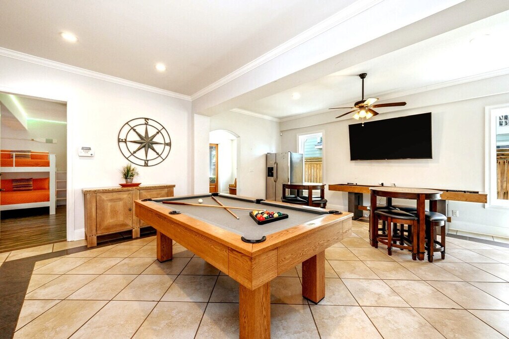 Feel at home in this breathtaking 3-story home in the heart of Crystal Beach. This 8-bedroom, 6.5-bath home is situated directly on Scenic 98, steps away from the white sandy beaches. The game room sets the tone for fun with a big screen TV, game table, shuffleboard table, pool table, and a bonus fridge. The kitchen is fully stocked with top-of-the-line appliances, dishes, utensils, cookware, small appliances (toaster oven, blender, hand mixer), and a small coffee bar area with a standard coffee pot and Keurig. A high chair, pack and play, kids cutlery, cups, and plastic dishes are available for tiny travelers. All linens (bed linens, towels, beach towels) are provided, with a washer and dryer in the home. Pool heating is available for an additional fee. A 6-passenger golf cart is available from October 1 to March 1. You are in the heart of Crystal Beach, directly across from the Destin Commons with plenty of shopping, entertainment, and restaurants. The Silver Sands Outlets are within a few minutes drive East with more shopping, restaurants, and a play area for kids. There are plenty of public beach accesses close by within walking/golf cart distance. SunBelievable is just 20-30 minutes from VPS airport (traffic permitting) and 15 minutes from popular destinations like HarborWalk Village, Baytowne Wharf, and Silver Sands Outlets. You’re also close to the Scenic Highway 30A and many Destin hotspots. Check-in is at 4:00 PM CST and check-out is at 10:00 AM CST. No student groups or guests under 25 are permitted. A maximum of 2 house-trained dogs are permitted with a $200 non-refundable pet fee due before check-in. Emotional Support Animals (ESAs) are subject to the pet fee; only ADA-registered service animals are exempt. Guests are expected to clean up after their pets or an additional $50 fee may apply for excess cleanup. There is parking to accommodate up to 5 vehicles, and street parking/blocking sidewalk/right-of-way may result in citation from the City of Destin to be paid by guests in violation. Tampering by a guest to the pool heater/temperature of the pool will result in a full charge. Guests must be 25 years or older to operate the golf cart. [SI]