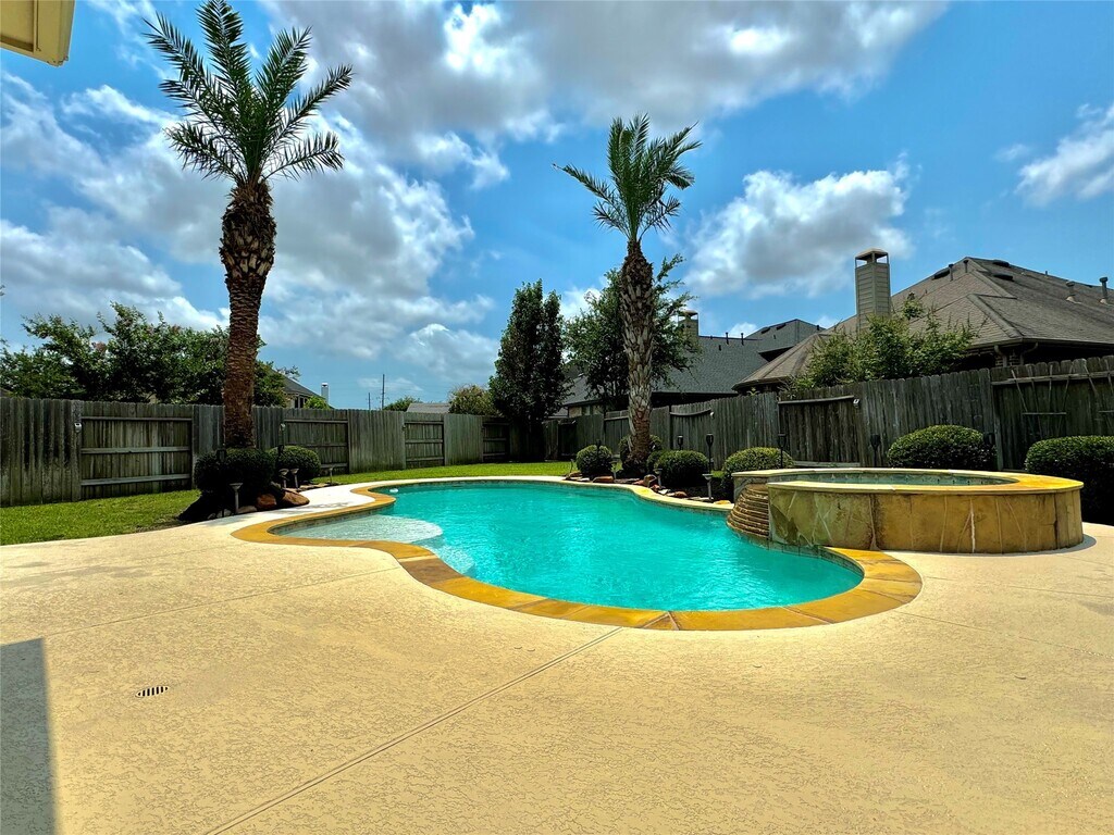 Imagine relaxing on this patio or in the heated pool and spa under the majestic date palms! Amazing secluded end of cul-de-sac location! Lots of room to play in the yard too! 3 car Garage with epoxy flooring. Modern plan makes with an open concept makes for a comfortable casual living lifestyle. Easy maintenance tile flooring in all main areas,warm woods in master bedroom! Master suite with large walk-in closet,whirlpool spa & separate relaxing full body shower. Split plan gives privacy to master suite! Abundant kitchen fitted with stainless appliances,3cm granite counters with a large serving island and,4 stage reverse osmosis water system providing clean drinking water at sink,fridge & coffee station. Automated home with conveniences like app driven thermostat,door access,security & camera system! Walking distance to in neighborhood Katy ISD elem. Fridge included. Weekly Pool maintenance included. Very clean & ready for move-in! MLS# 27197275