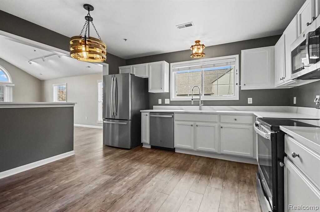 Completely updated 2 bed/2 bath upper end unit condo with a 2 car garage located in the heart of Novi! 2023/2024 - New kitchen with white cabinets, stainless steel appliances and breakfast bar that seats 2, new bathrooms, new flooring, fresh paint and new washer and dryer. Vaulted ceiling great room with fireplace, balcony and floor to ceiling windows. Designated dining area. A great condo in a great community located close to expressways, shopping, restaurants and entertainment venues. Complete RentSpree online rental application. Minimum 12 month lease. 1.5 mos security deposit and $150 vacating cleaning fee required. Pets are negotiable and require an additional pet deposit.