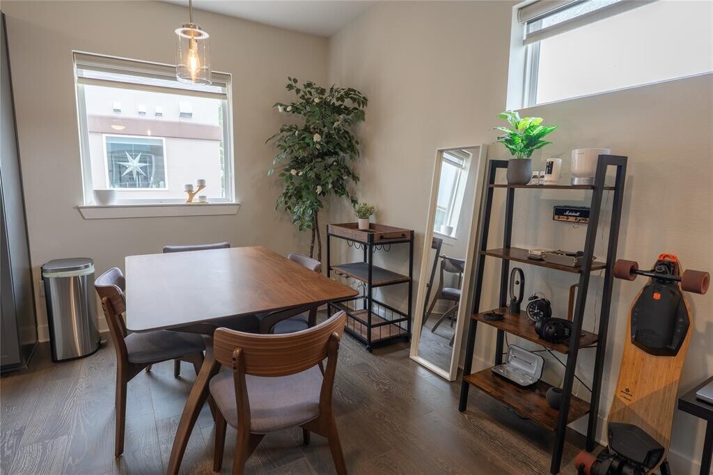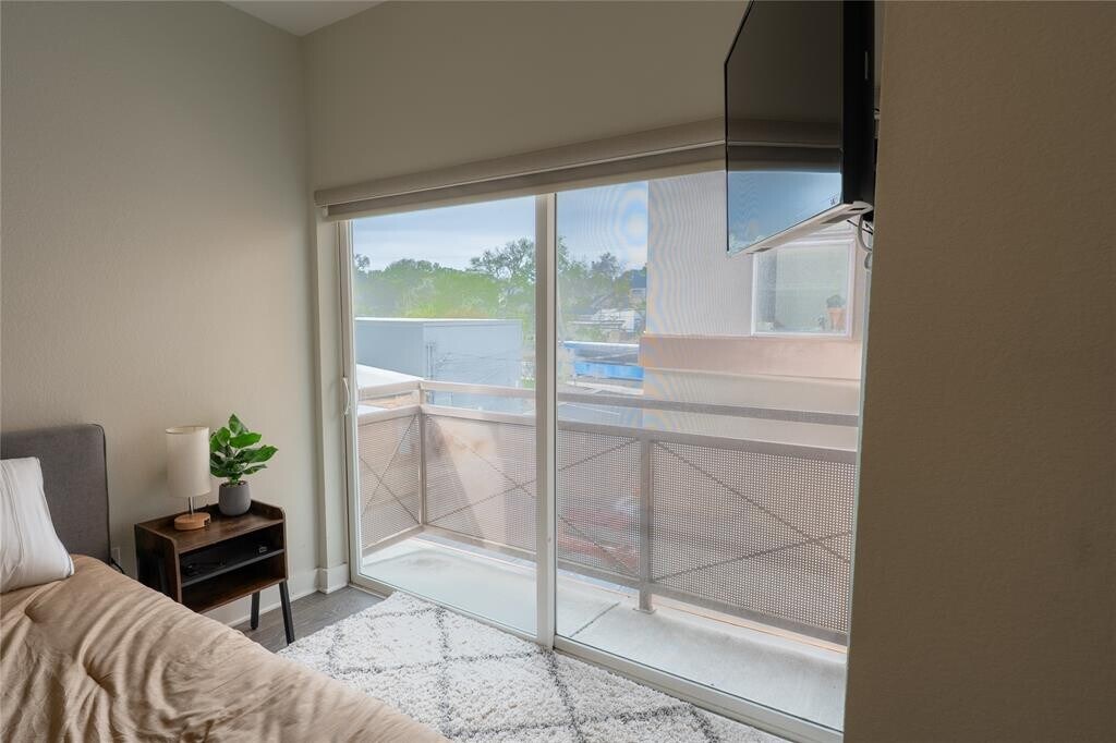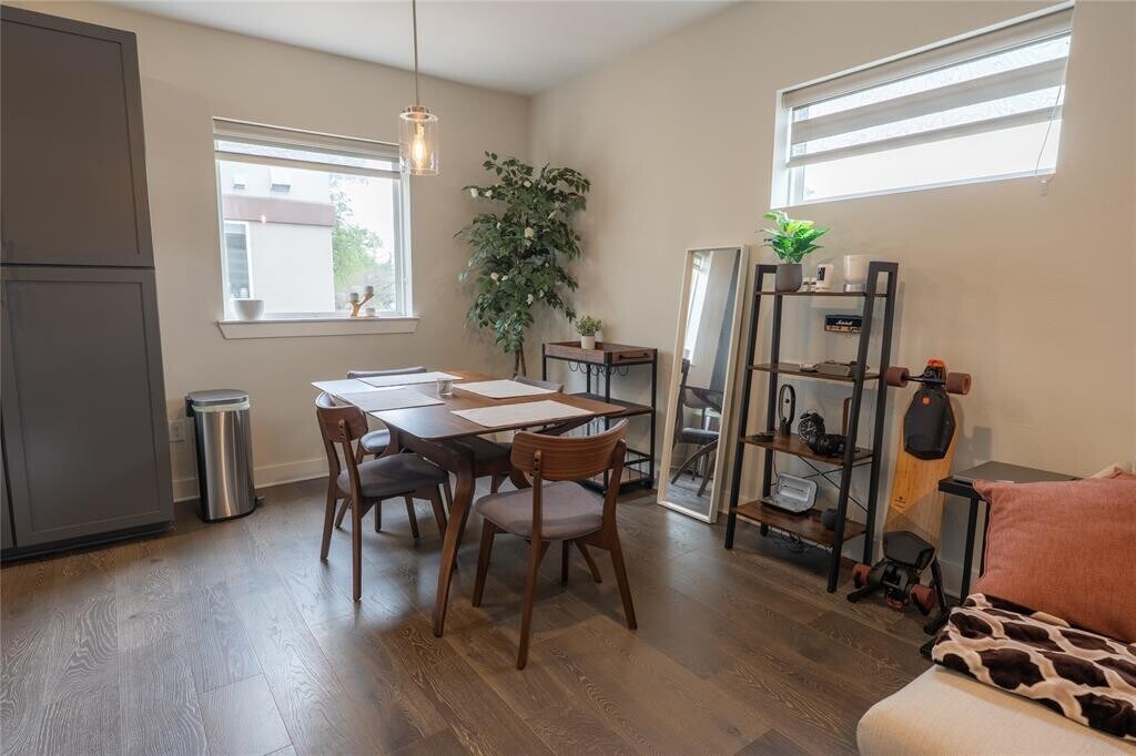 This stunning furnished 2 bedroom, 2.5 bath condo is less than 2 miles from downtown, UT, and surrounded by some of Austin's best restaurants. This property is located gated complex and features a townhouse feel with 3 stories and corner location, a 1st-floor entry, and an attached two car garage. Open living areas on the second floor with gorgeous hardwood flooring, high ceilings, and ample natural light from the large sliding glass doors. The modern kitchen features gray shaker-style cabinetry, quartz countertops, a tile backsplash, and stainless-steel appliances including a gas range. Open living & dining area perfect for entertaining or relaxing. The top floor features the primary bedroom with an ensuite bathroom and two spacious closets. There is a second bedroom with an ensuite bathroom on the same floor. Balconies include one off the living room and one off the primary suite. Unit includes stackable washer and dryer. Outdoor Activities include several parks, such as Eastwoods Park and Downs Mabson Fields. The nearby Mueller Lake Park also features walking trails, a farmers market, and a play area. Easy Access Commuting to I-35 or 183. Capital Metro’s MLK Jr Station, making downtown Austin just minutes away. MLS ID 5139749