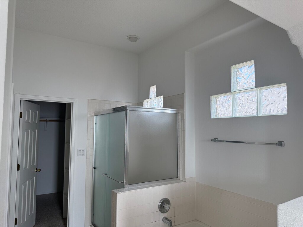 This property features three bedrooms, two bathrooms, a two-car garage, a fireplace, and a gated courtyard. It also includes an eat-in kitchen and a primary bedroom with double sinks. The property has new carpet throughout.