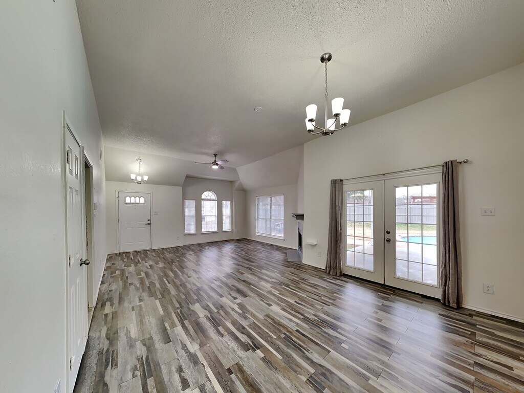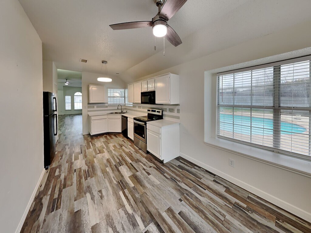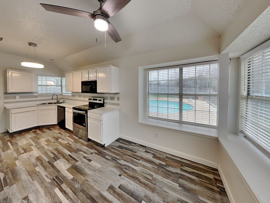 Beautiful single-story brick home located in the desirable River Trails Addition, offering exceptional curb appeal with mature shade trees and a charming drive-up. Step into your own private backyard oasis featuring a sparkling pool—perfect for Texas summers (pool care included)—and a covered patio ideal for outdoor entertaining and weekend BBQs. The home backs to a serene greenbelt, providing added privacy and peaceful views. Inside, you’ll find a spacious, light-filled layout with a large family room featuring a decorative fireplace that flows seamlessly into the formal dining area—perfect for hosting. The home boasts fresh neutral paint, newer luxury laminate flooring (no carpet), vaulted ceilings, ceiling fans, and 2-inch blinds throughout. The kitchen is both stylish and functional with stainless steel appliances, quartz countertops, white cabinetry, designer backsplash, refrigerator included, and a cozy breakfast nook. The primary suite offers a relaxing retreat with dual vanities, a garden tub, and a medicine cabinet for added storage. Enjoy nearby community amenities including walking trails, a lake, park, and playground—all within walking distance. Conveniently located with easy access to major highways, making commuting to Fort Worth, Arlington, and nearby shopping, dining, and entertainment a breeze. This is a must-see home and won’t last long! Call-Text Sarah Braddock for details .