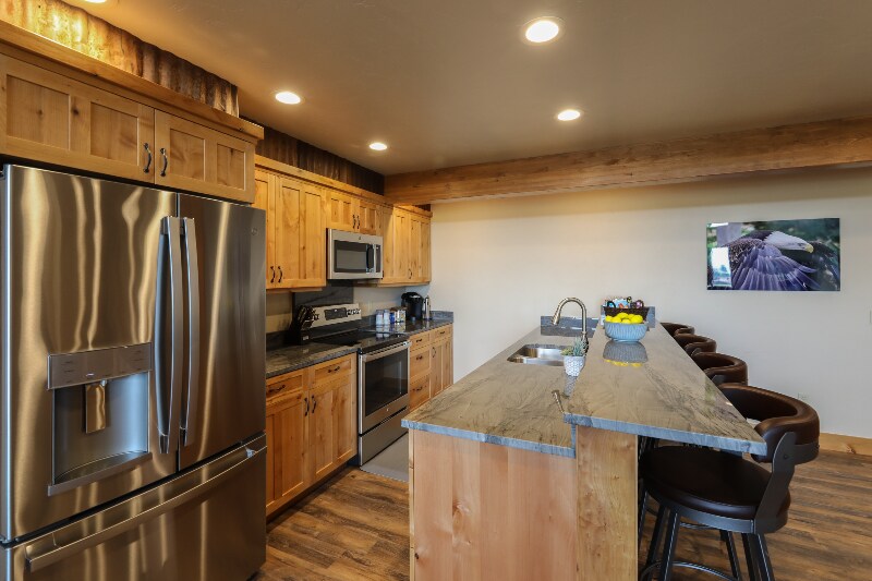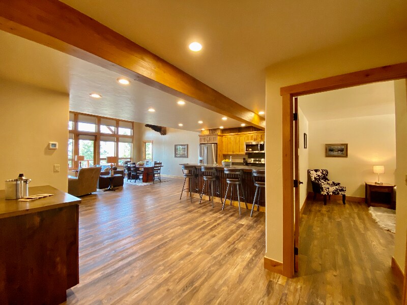 Property Id: 2080155 Available 10/15 - 5/31, pets negotiable pet rent and deposit would apply. The main floor layout is an open living concept with a spacious kitchen, dining, wet bar, and living area. The second-floor loft area provides a queen size pull-out couch for additional sleeping and sitting as well as a laundry room with washer and dryer. The Glacier unit loft has a large sitting area and game room with a custom made, Montana made and inspired, cowhide game table. This unit is equipped with 2 bedrooms with en-suites, king beds furnished with luxury linens and bedding, and spacious walk-in closets. Each bedroom is equipped with smart TV capable of streaming all your favorite apps. Amenities: In unit washer/dryer, heated garage, walk-in closets, bedrooms w/ ensuites, deck with golf course and mountain views, air conditioning, custom finishes, all utilities included: electricity, internet, water and sewer, garbage, Netflix, Hulu Live+, Disney, ESPN+, and snow removal (over 3”) are all included.