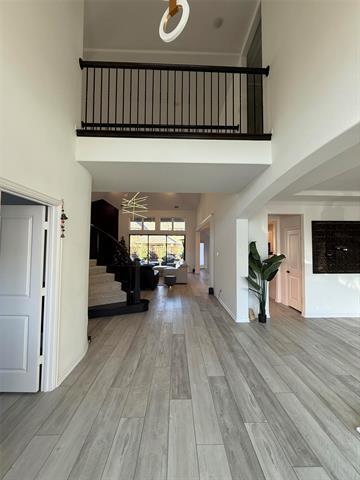 Modern 4,387 sq ft semi-custom home in highly sought-after Prosper ISD with an open floor plan, double-height ceilings, oversized windows, and abundant natural light. Contemporary black-and-white design with premium flooring throughout. Spacious 5 bed 4.5 bath layout with 2 bedrooms on the first floor, plus study, media room, game loft, formal dining, and breakfast nook. Kitchen features stainless steel appliances, a large walk-in pantry, and ample storage. Includes motorized blinds, smart and energy-efficient features, walk-in closets, and an epoxy-finished 2-car garage. Covered patio and large backyard. Community amenities include pickleball courts, walking trails, and a pond. Zoned to Walnut Grove High School, near Whole Foods, shopping, and within 30 minutes of major offices.